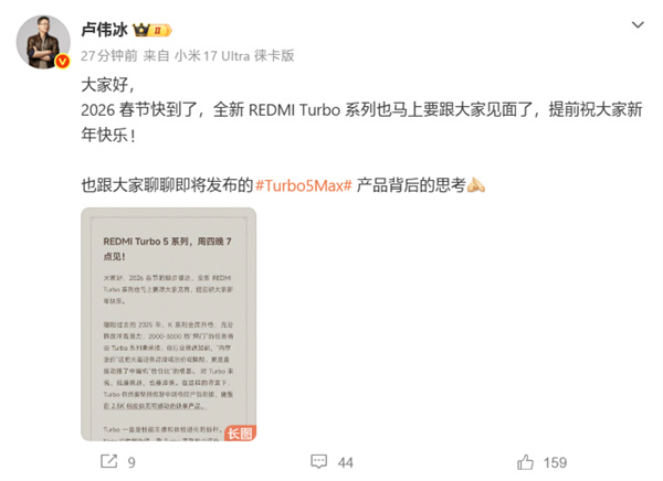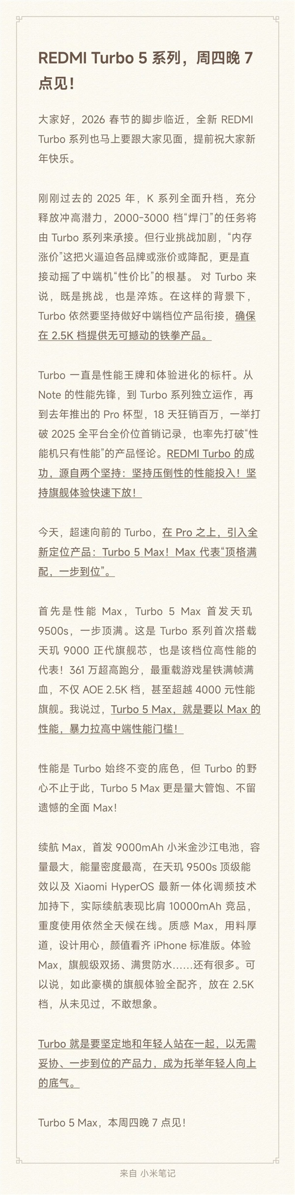 快科技1月26日消息,REDMI Turbo 5系列将在1月29日发布,Turbo 5、Turbo 5 Max两款同时登场。