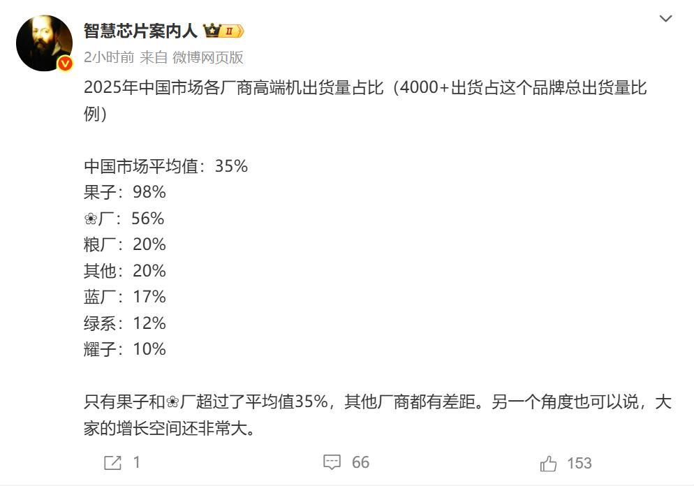 國內高端手機市場,蘋果和華爲一直處於絕對領先的地位,雖然糧廠粉絲一直在吹噓高端成了,但慘遭數據打臉。博主“芯片智慧案內人”爆出了2025年國內各品牌高端手機出貨量佔比,蘋果毫無懸念拿下第一,華爲緊隨其後,雖然糧廠排名第三,但佔比不足華爲的一半,不足蘋果的1/4,也低於平均值,何談高端成了。