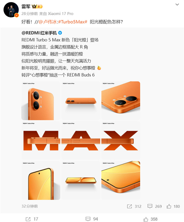 REDMI Turbo 5 Max新机主打的新配色名为“阳光橙”,与小米品牌LOGO底色接近。官图公布后,雷军第一时间进行了转发,并大赞“好看”。