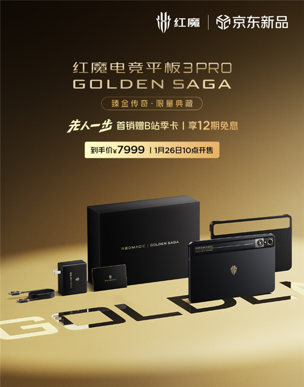 快科技1月26日消息,紅魔電競平板3 Pro GOLDEN SAGA臻金傳奇今天正式開售,定價是7999元。