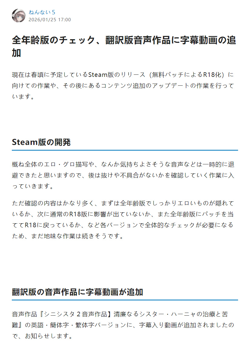 《SiNiSistar2》轻量版预计今年春季登陆Steam平台,Steam版为全年龄版本(可打补丁)。