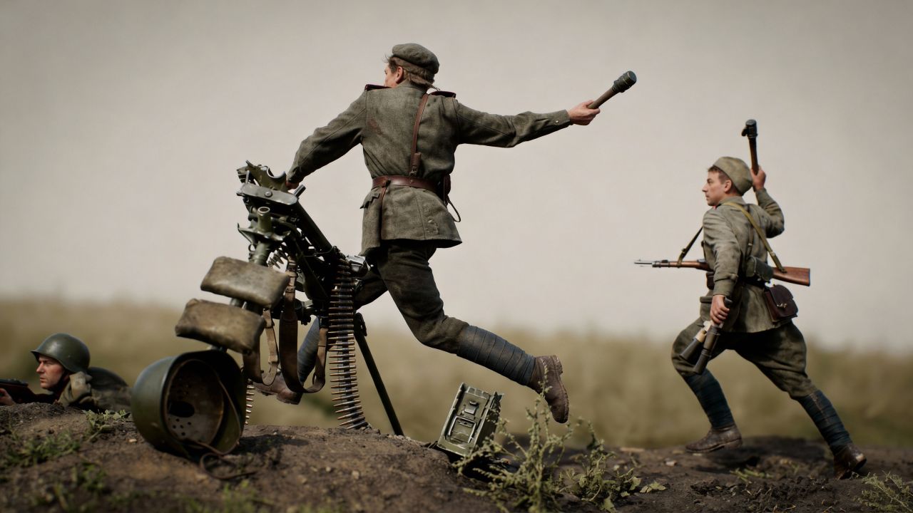 画面没有英雄化的摆拍姿态,而是直接、粗粝、近乎本能的瞬间捕捉。士兵的面部被军帽和烟尘遮挡,身份模糊,却正因如此更具普遍性——他们代表了数百万在冰天雪地、炮火连天中冲锋的普通人。被击毁的机枪、散乱的弹壳、翻卷的铁丝网,这些细节无声地诉说着刚刚结束的激烈交火,也预示着下一轮冲锋即将到来的代价。