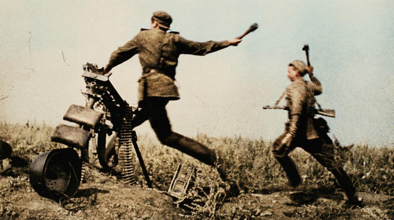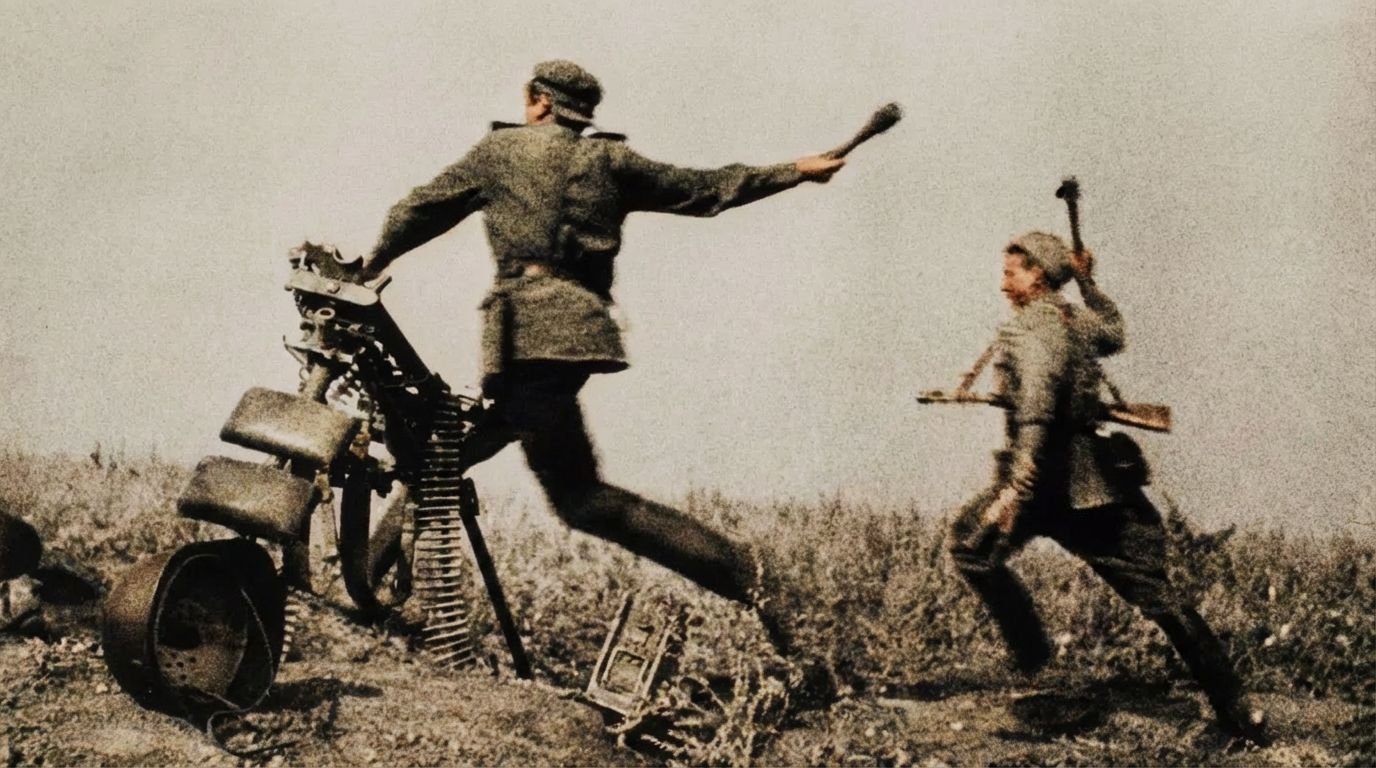 1943年,苏联卫国战争进入最激烈阶段,红军在库尔斯克、斯大林格勒、列宁格勒等方向发起战略反攻,德军防线开始全面崩溃。这张照片定格了战场最真实的一瞬:一名红军士兵跃过被击毁的机枪阵地,身体前倾、右臂高举手榴弹,左手紧握步枪,军大衣下摆在奔跑中剧烈摆动,身后是翻倒的重机枪、散落的弹链和被炸毁的土木工事。另一名士兵紧随其后,高举步枪冲锋,泥土被靴子踢起,硝烟与尘土弥漫在低矮的天空下,整个画面充满动态张力与生死交错的紧迫感。