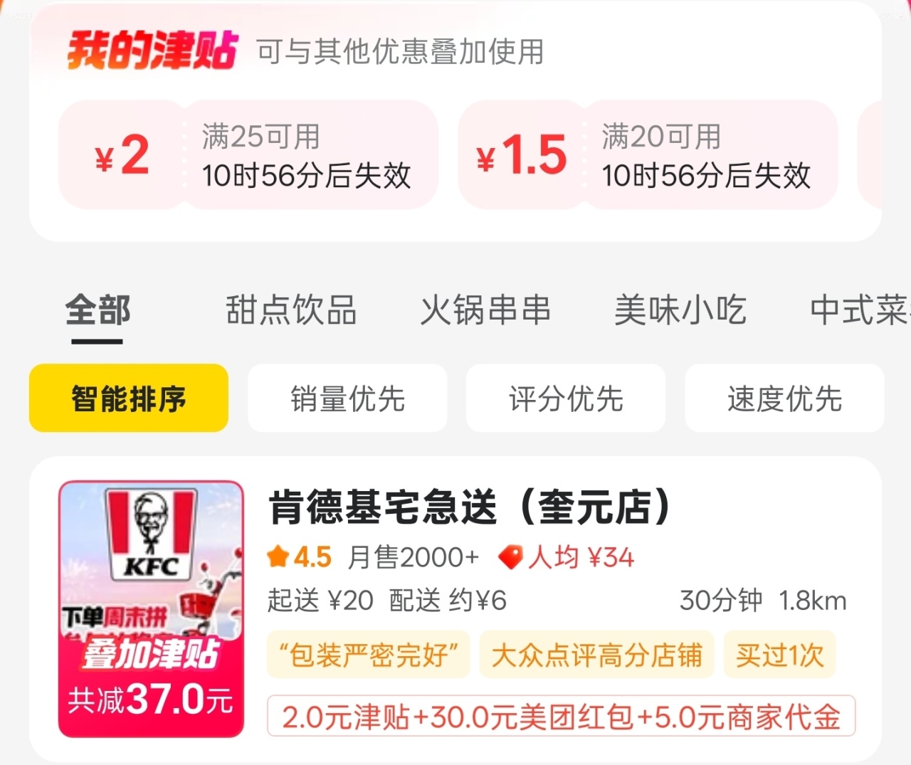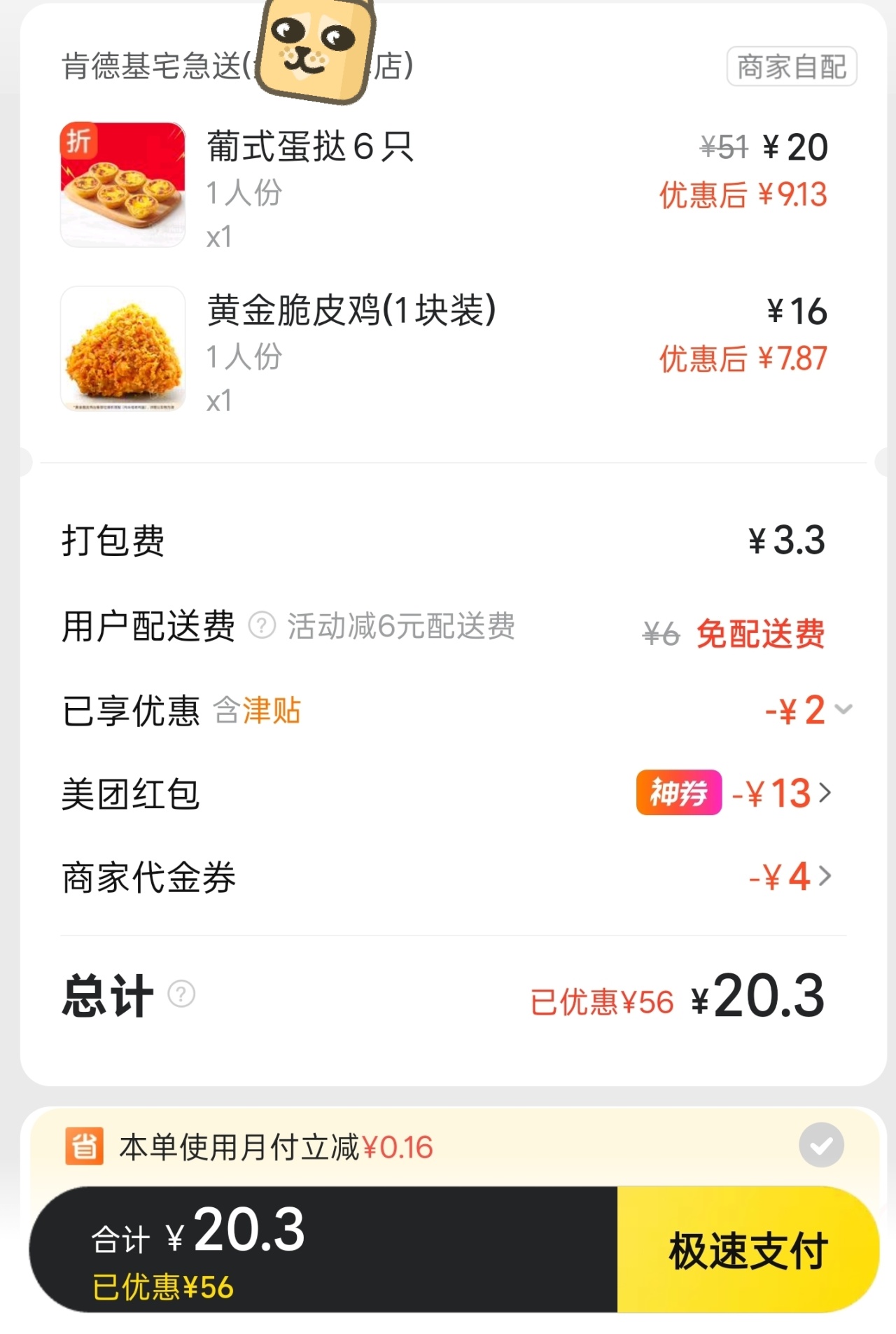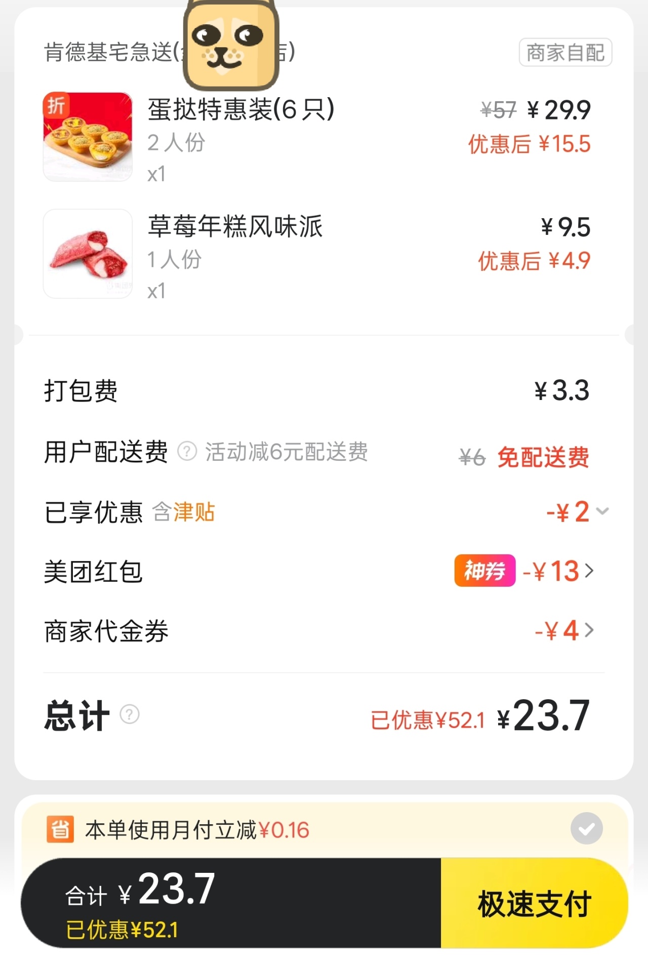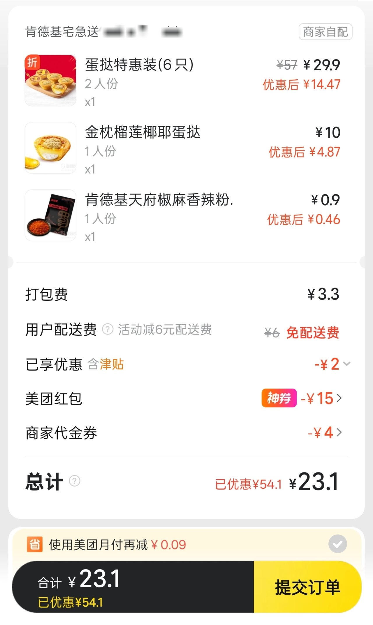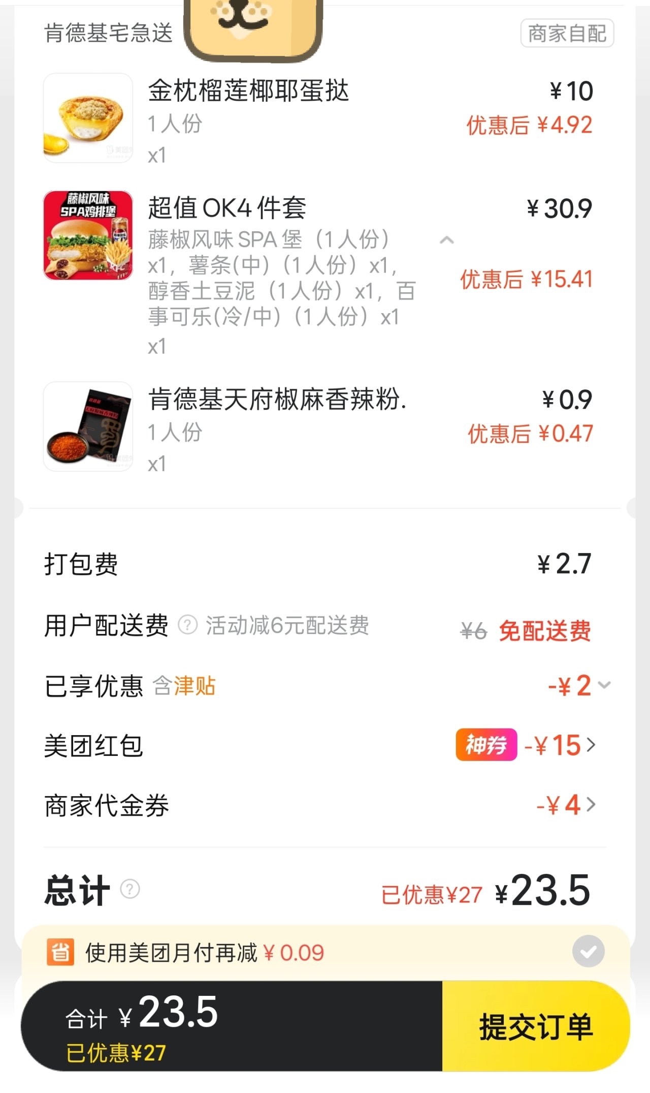 今天的肯德基基本都是满39-6配送费!