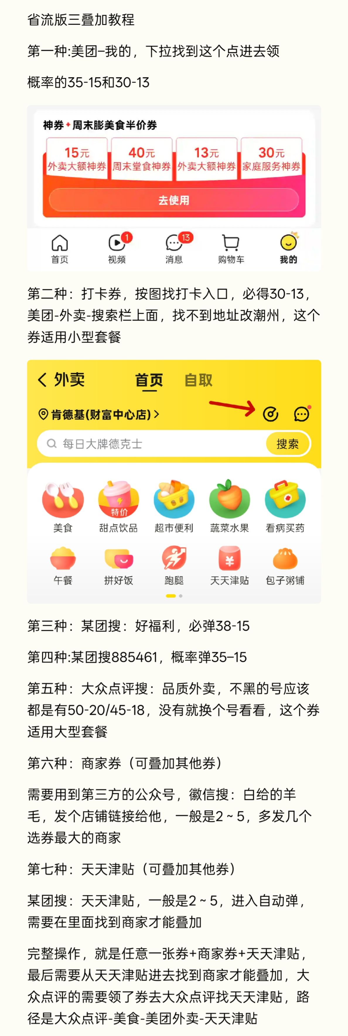 然后最后一步,领完两个券回到某团搜天天津贴,点进去找到你发送的店铺,然后这里应该就可以看到三个优惠叠加到一起了