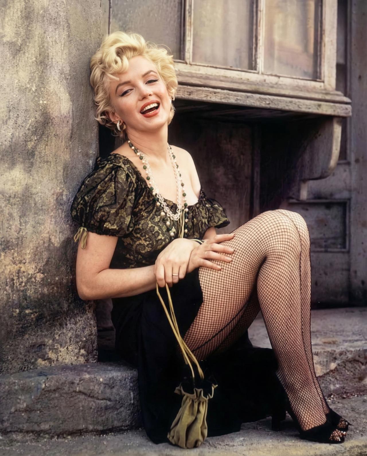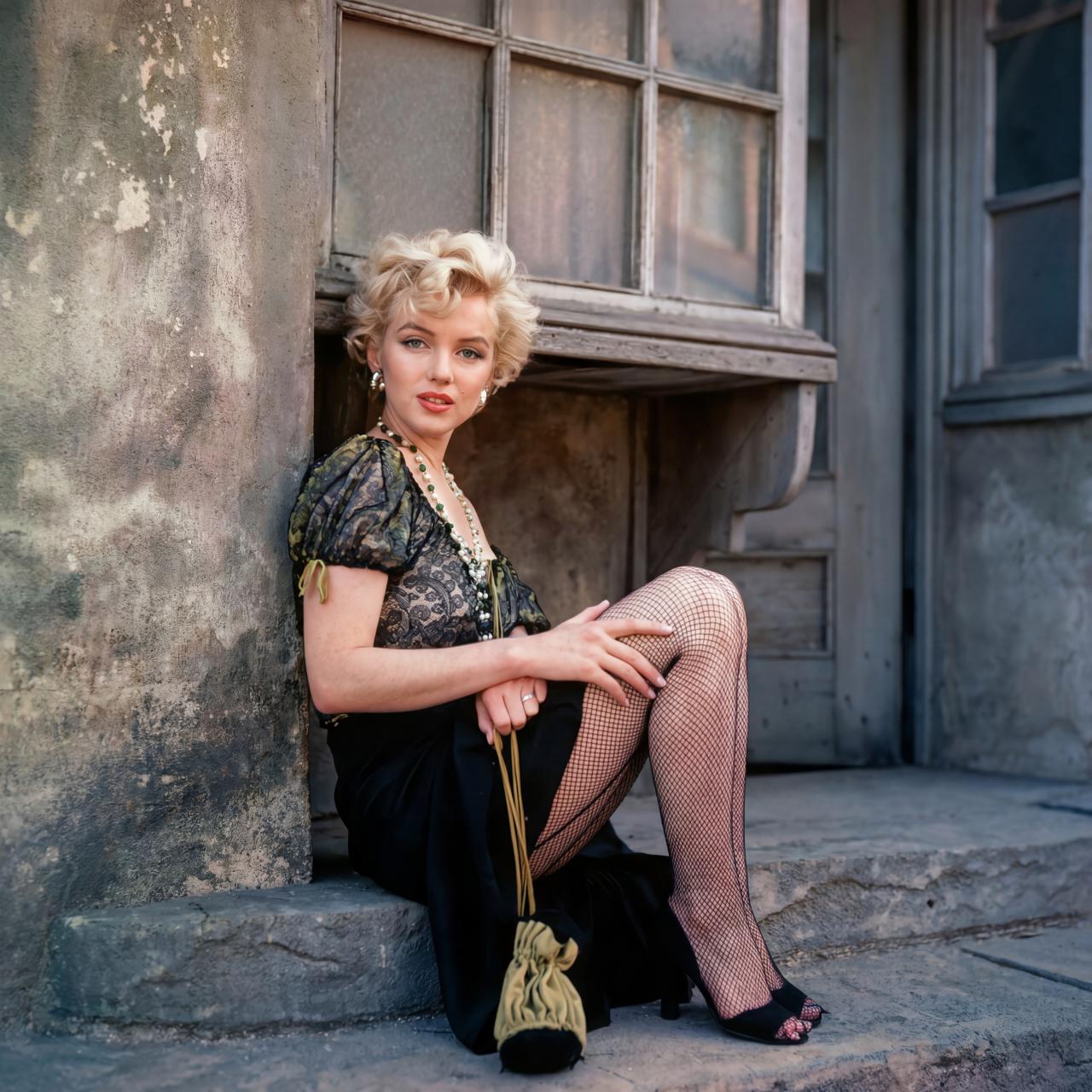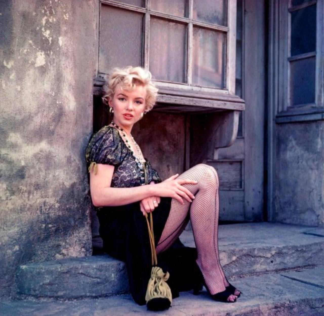 照片捕捉了夢露在片場排練的一瞬:她飾演的Cherie坐在一棟破敗建築的石階上,背景是斑駁的灰牆和塵封的窗戶,暗示着角色底層生活的窘迫。夢露身穿深色蕾絲短袖上衣,領口微敞,層層項鍊纏繞頸間,下身是貼身的黑色短裙和魚網絲襪,一隻腳穿着露趾高跟鞋,另一隻隨意脫下。她右手輕握一個小巧的抽繩手袋,左手搭在膝上,身體微微前傾,靠着牆壁,眼神直視鏡頭,嘴角微抿,流露出一絲疲憊卻堅韌的複雜情緒。金色短捲髮在陽光下微微泛光,整體姿態既性感又帶着一絲無助,空氣中彷彿瀰漫着沙漠小鎮的乾燥塵土與化妝品的淡淡香味。這種場景並非單純的劇情再現,而是夢露在片中真實投入的體現,她後來回憶稱,這部影片讓她首次感受到作爲演員的滿足。