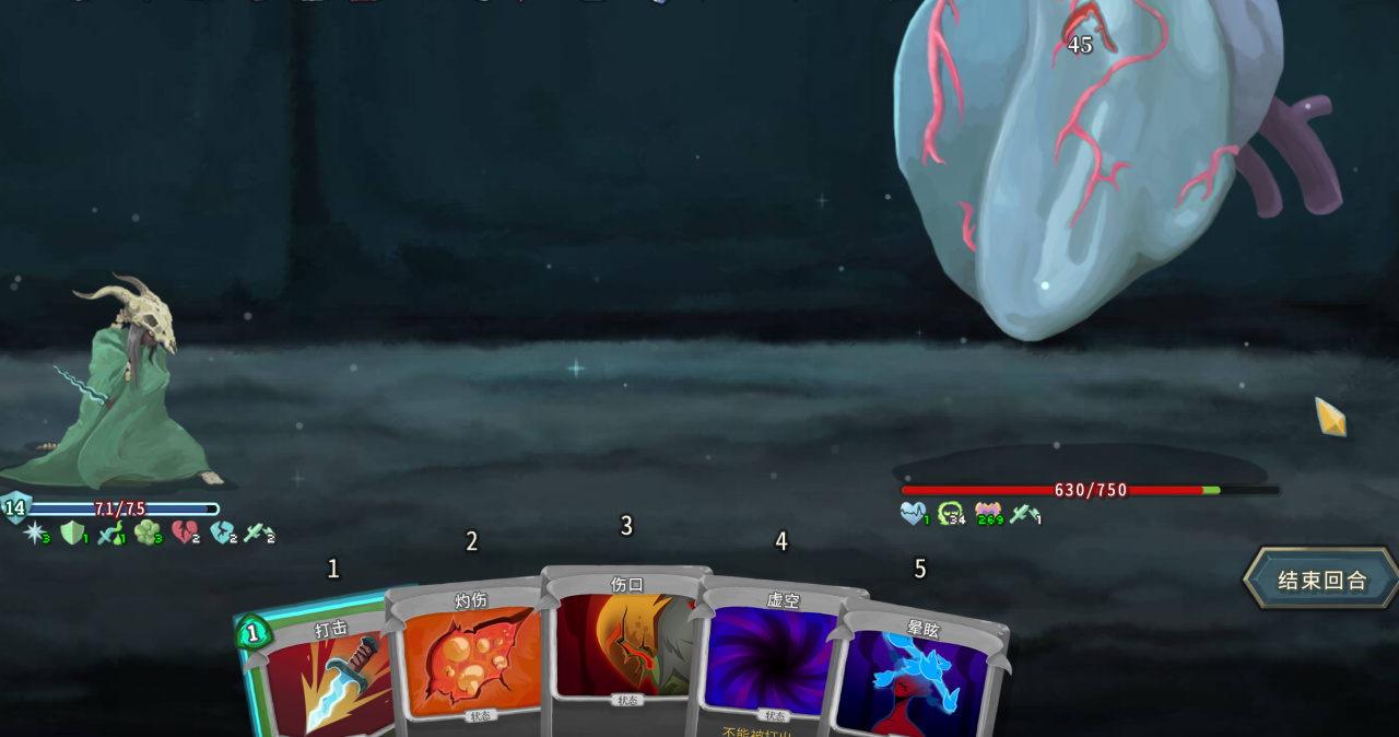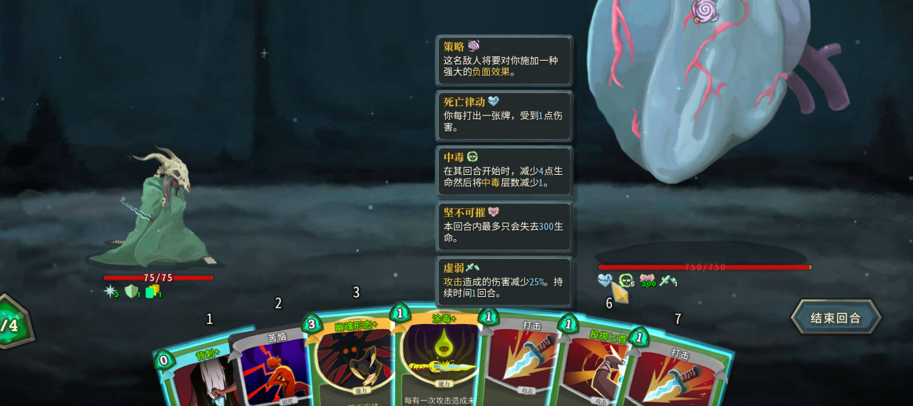 心脏一共有两个被动技能,分别是死亡律动和坚不可摧,两大机制锁死了卡组上限,这也是游戏作者设计的精妙之处。 死亡律动:最折磨新手的机制!你每打出1张卡牌,自身就会受到1点伤害(进阶19+后直接翻倍为2点)。这意味着多牌循环流派(如刀贼)会自我残血,哪怕没被心脏攻击,也可能被自己“抽死”。