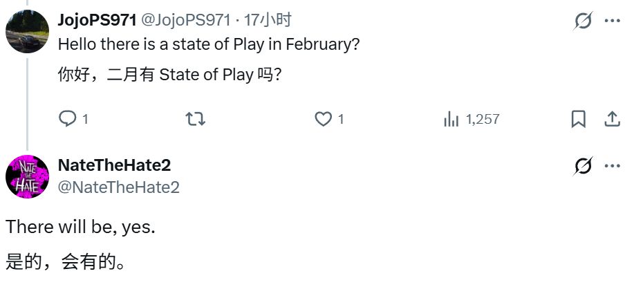 据知名业内消息人士NateTheHate透露,索尼计划于2月举办新一期PlayStation State of Play线上发布会。此次信息源于X上的直接交流。用户JojoPS971提问:"你好,请问二月份会有State of Play吗?" NateTheHate对此回应称:"会有的,是的。"