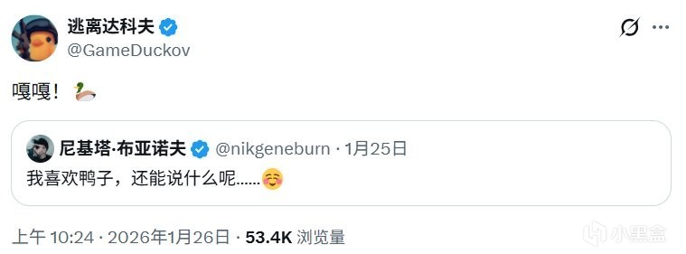 这场让玩家沸腾的联动,并非一蹴而就,而是通过两次官方互动逐步揭开面纱,每一步都充满趣味,贴合两款游戏的调性。1月24日,《逃离塔科夫》开发商Battlestate Games的官方账号率先发力,发布了一则神秘公告,文案暗藏玄机:“一次狂野狩猎即将开始,你准备好猎鸟(可能是指鸭子)吗?还是成为其他猎人枪下的猎物?”文案下方,还特意配上了一张印有鸭子图案的标靶图片——结合《逃离鸭科夫》的鸭子核心元素,这一暗示几乎毫不隐晦,瞬间引发玩家热议,纷纷猜测这是两家联动的预热信号。仅仅一天后(1月25日),Battlestate Games负责人尼基塔进一步加码,发布了一条神秘帖子,直言:“我能说什么呢......我喜欢鸭子”。这番直白又俏皮的表态,相当于直接放下暗号,而《逃离鸭科夫》官方也迅速接梗,在该帖子下方留下了一声清脆的鸭叫回应,一唱一和之间,彻底坐实了两家联动的消息。