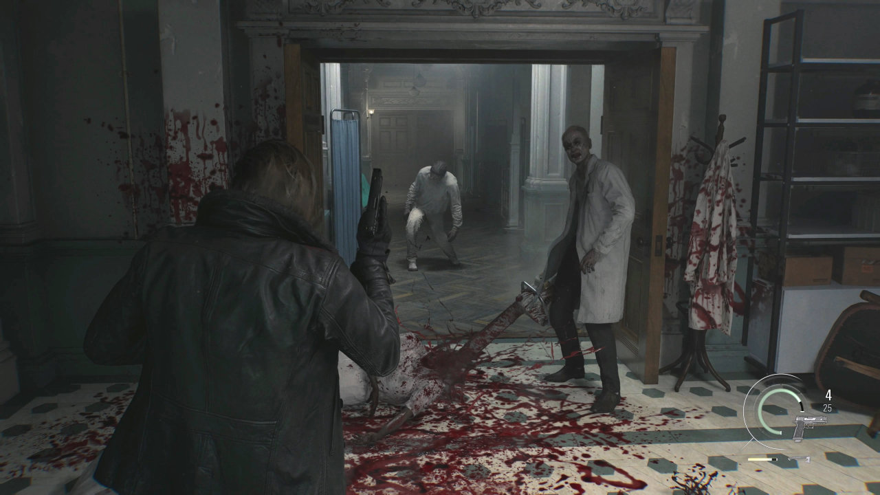 里昂代表系列自《生化危机4》以来的动作进化路线。采用第三人称越肩视角,战斗更为直接、线性且富有冲击力。里昂拥有招架能力和更强大的武器库,关卡设计侧重动作与爽快感,其流程通常无需手动存档,由检查点系统自动覆盖。