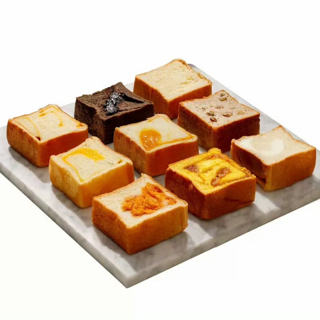 海鹽芝士、鹹蛋黃、爆漿巧克力味、楊枝甘露等9種口味,嚴選小麥粉+生牛乳+新鮮雞蛋液+赤蘚糖醇,六小時充分發酵,柔韌有嚼勁,新鮮日期製作,常溫短保20天,配咖啡、牛奶當早餐剛好。