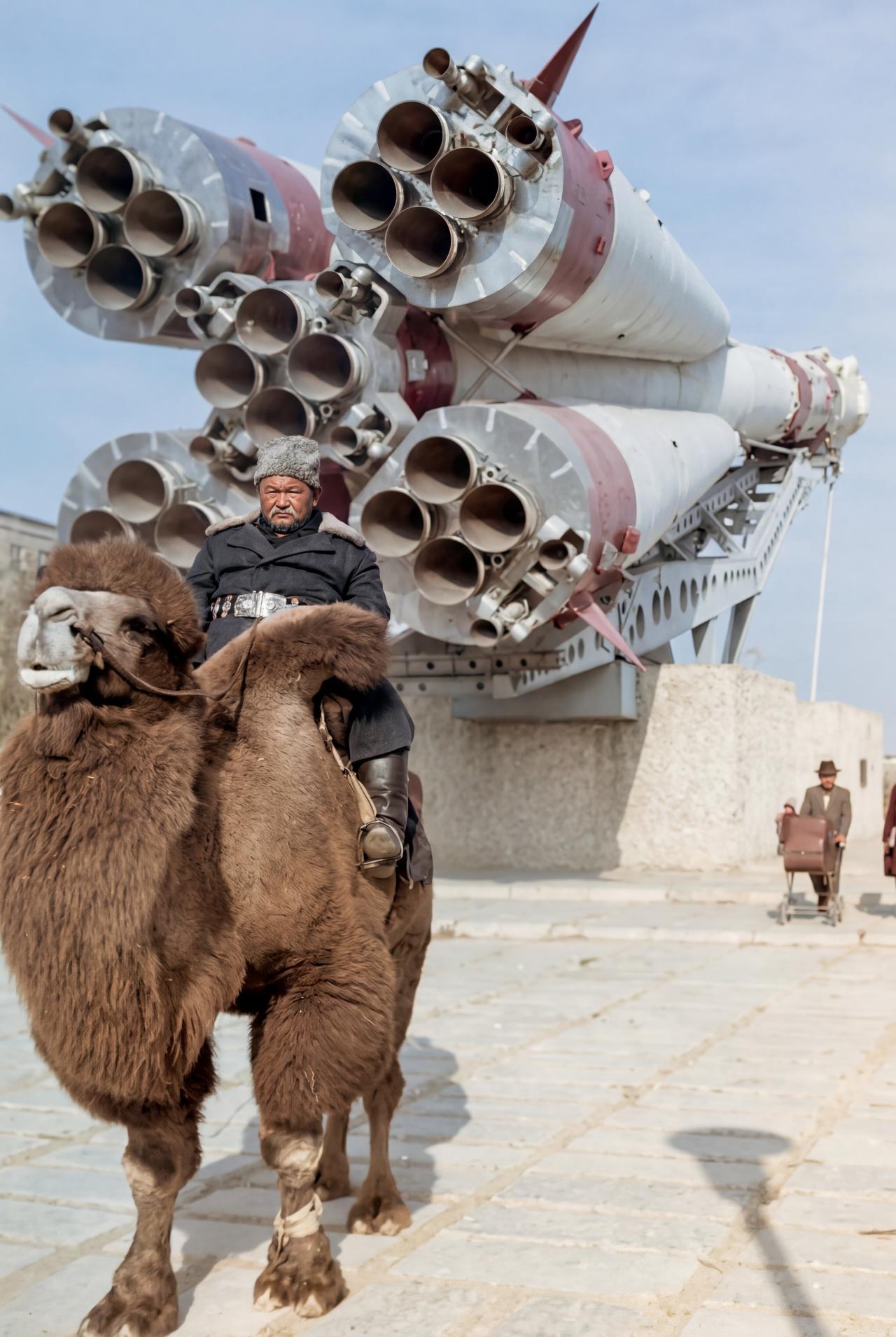 纪念碑基座是粗犷的混凝土平台,天空湛蓝,整个场景笼罩在一种荒诞却又真实的张力之中——人类最尖端的太空梦想与千年不变的游牧生活在此并置,象征着苏联在中亚进行的现代化进程,以及当地人在巨变中平静而坚韧的适应方式。