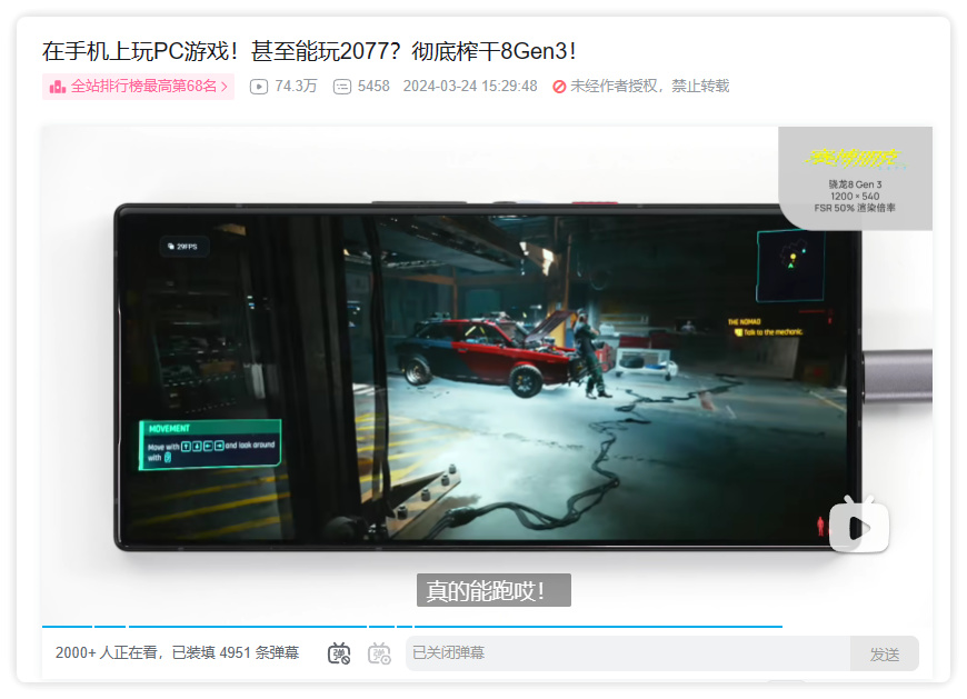 B 站@极客湾Geekerwan 使用「MOBX」工具在安卓手机上玩 PC 游戏的方法,甚至挑战运行《赛博朋克2077》游戏。