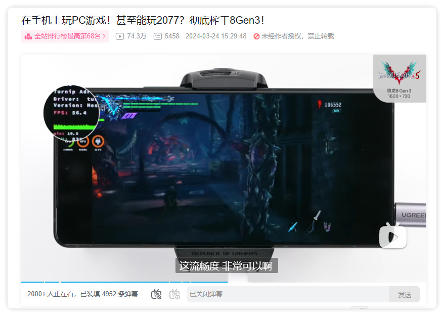 据极客湾的测试在 8Gen3 上《鬼泣五》在手机上表现相当不错,720P 分辨率可以跑到 50+ 帧,并且能正常读取外设。