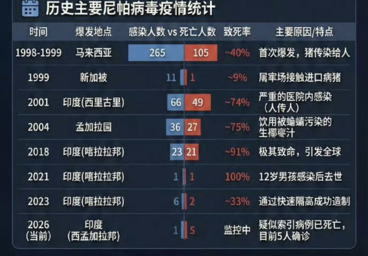 2026年开年,印度公共卫生安全再遇严峻挑战,东部西孟加拉邦突发尼帕病毒疫情,确诊病例出现明确的人际传播迹象,多名医护人员院内感染,近百名密切接触者被紧急隔离。