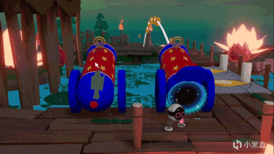 在某个关卡的岸边,荷花池畔,你会发现用于穿越到对岸的大炮。别急着把自己当成炮弹发射出去:先转动手柄调整发射轨迹,它会通过一条白色的曲线来显示你的飞行轨迹。然后,你就可以化身“活体炮弹”,一边飞跃一边收集金币啦!