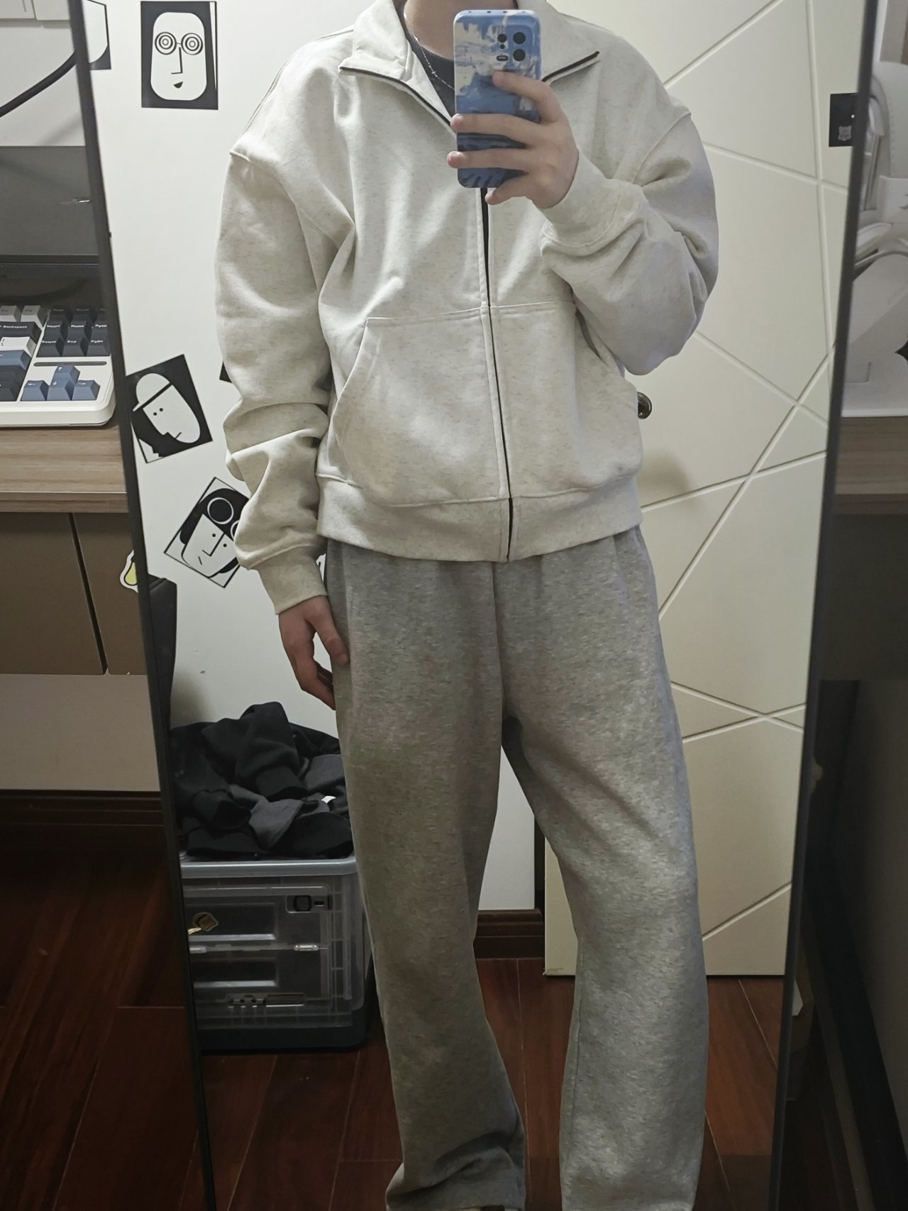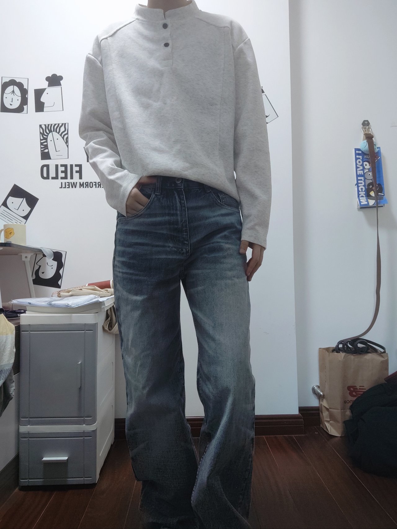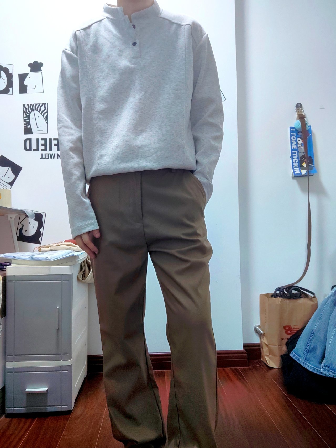 直筒版型 上身比较宽松舒适 垂感不错 面料比较厚手感丝滑 走线采用更结实的三本针工艺 口袋布不廉价手感好 有点粘毛 做工质量可以 有一点线头 性价比不错