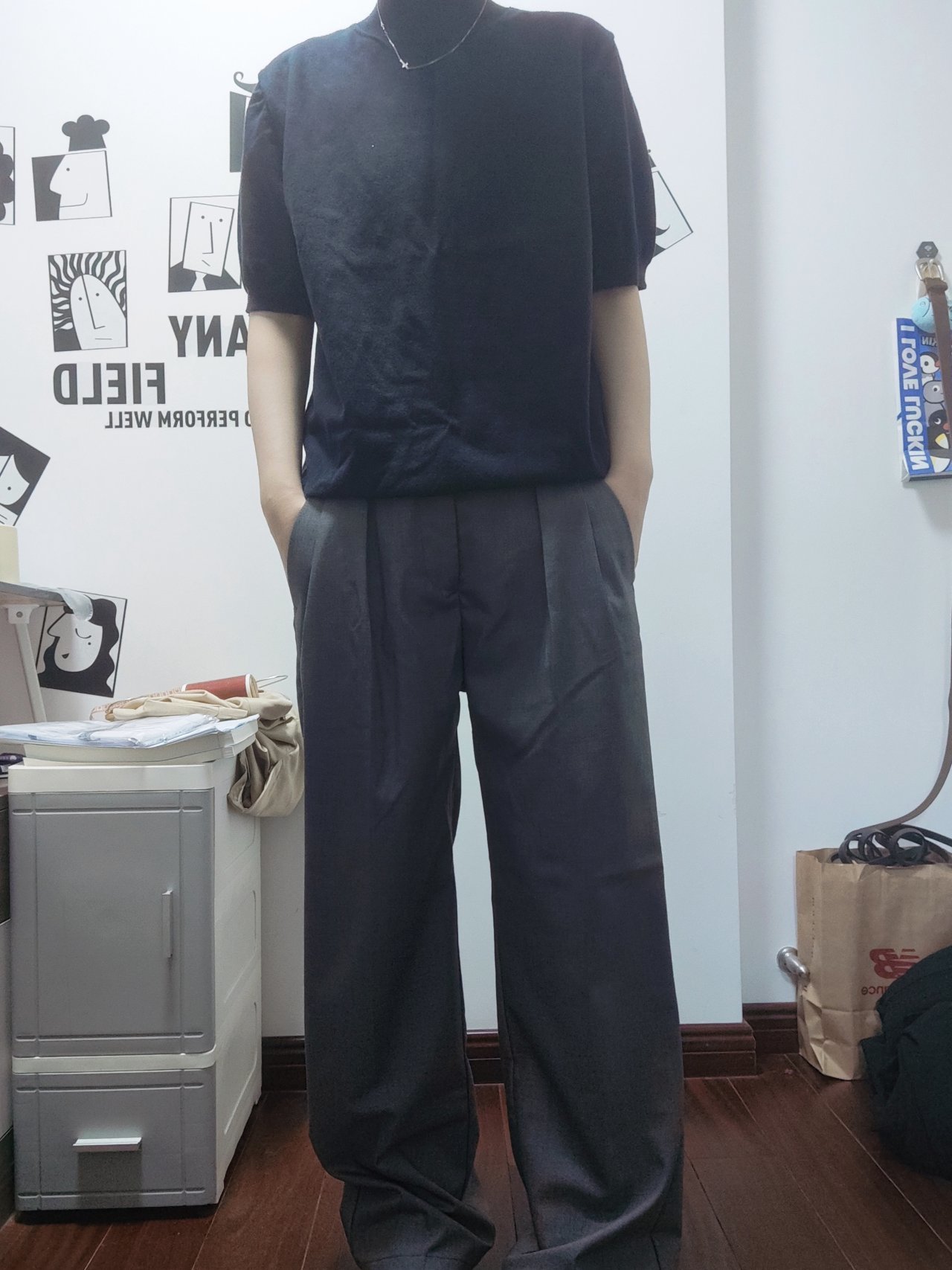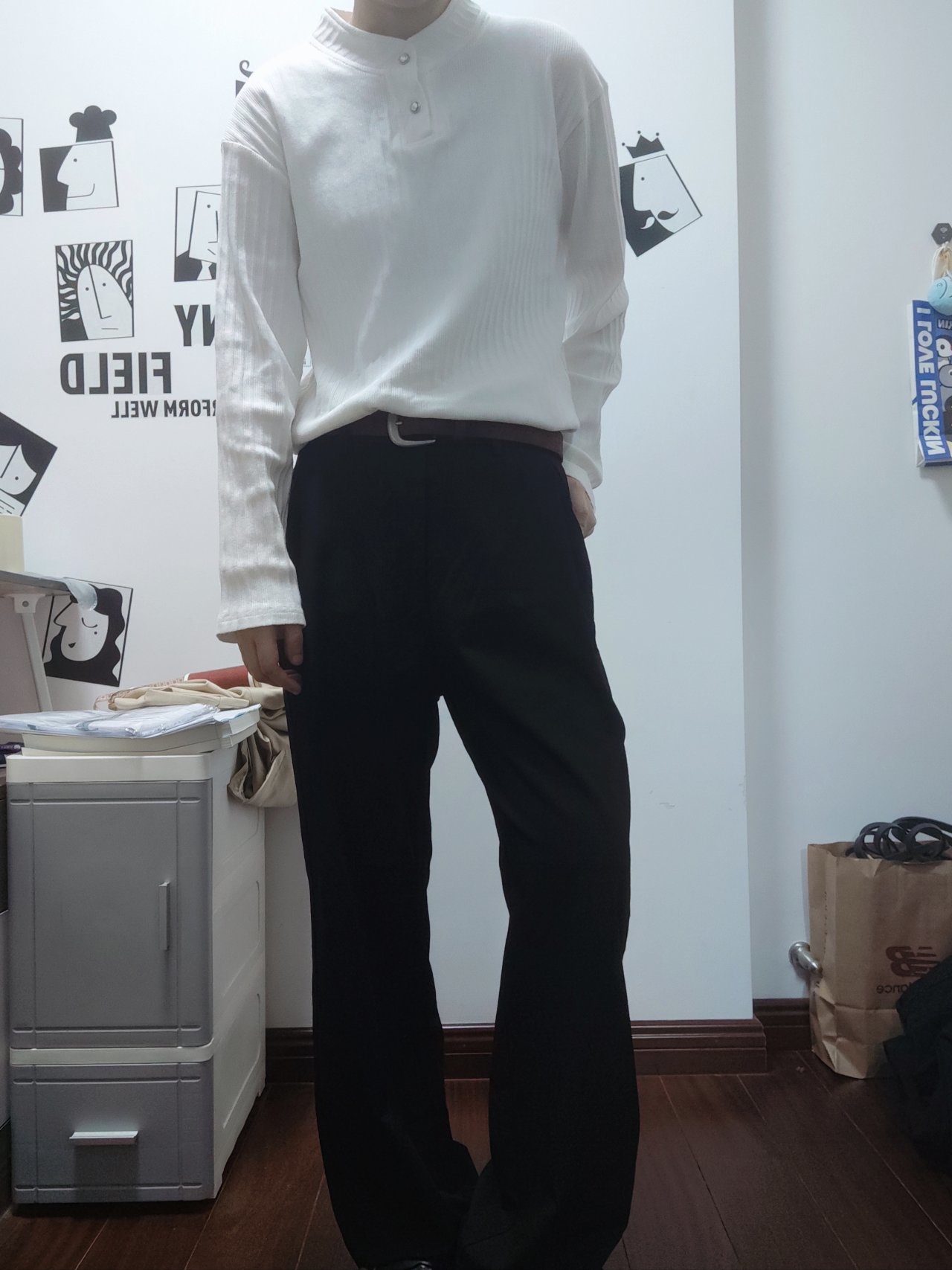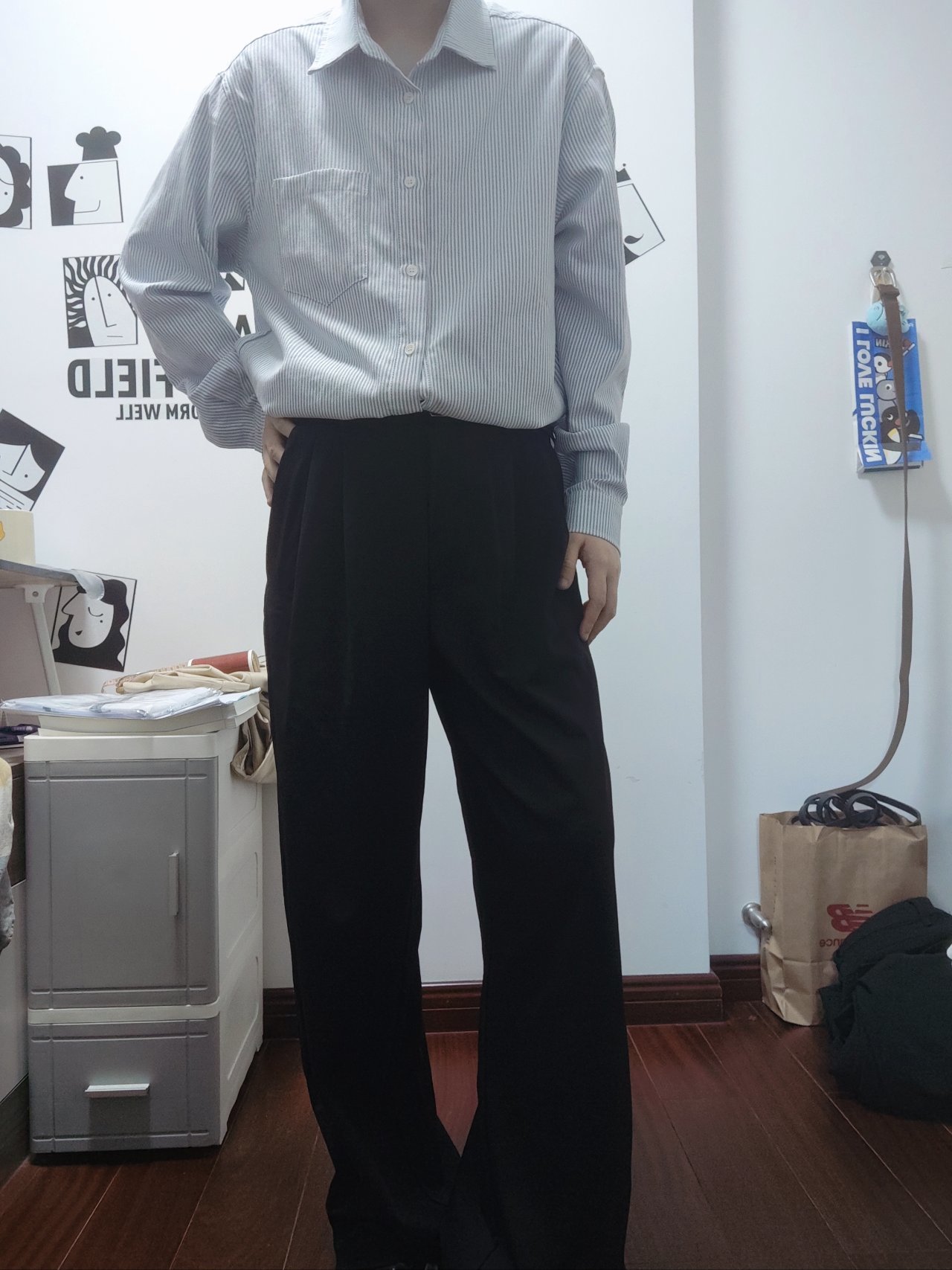 微喇版型 有黑色和香槟金 上身比较宽松 裤长很长矮个子慎入 用的tr复合面料很抗皱 面料很丝滑有厚度 口袋布一般 拉链一般不是很顺滑 做工质量还可以 有线头 性价比不错