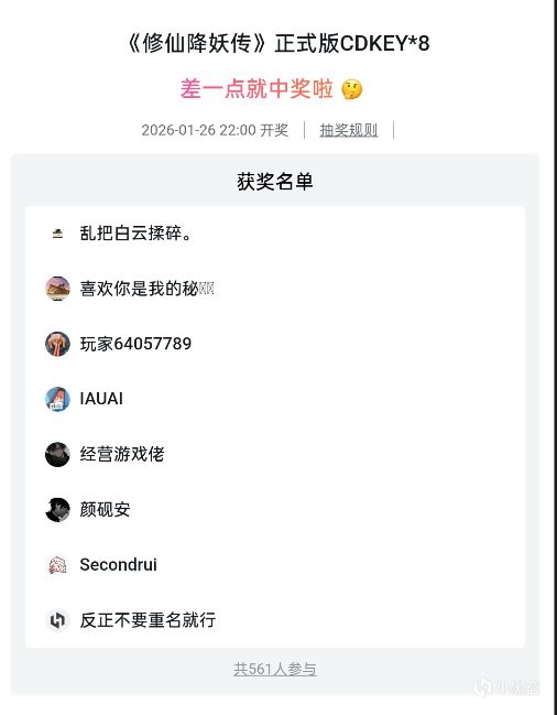 同时也热烈祝贺以下8位中奖的道友!CDKEY已通过小黑盒发放,请注意查收。期待正式上线时,在游戏里与你们相遇!