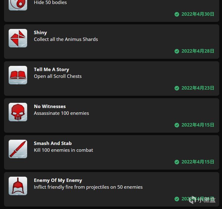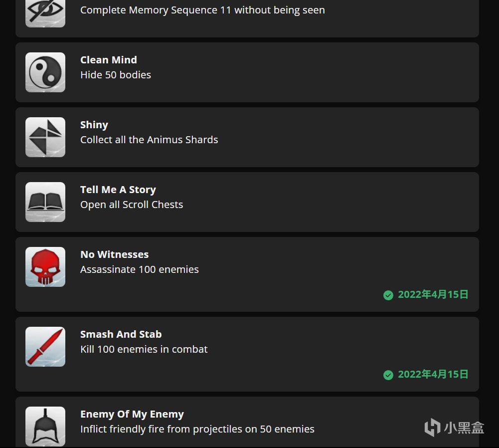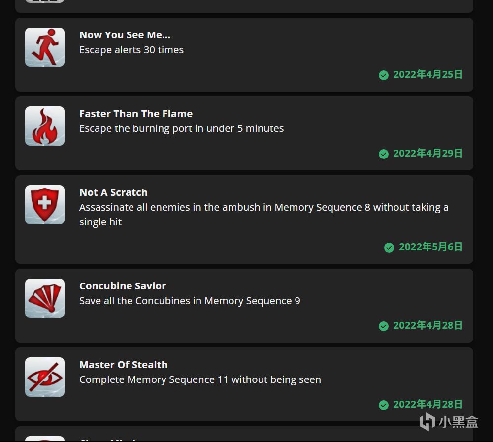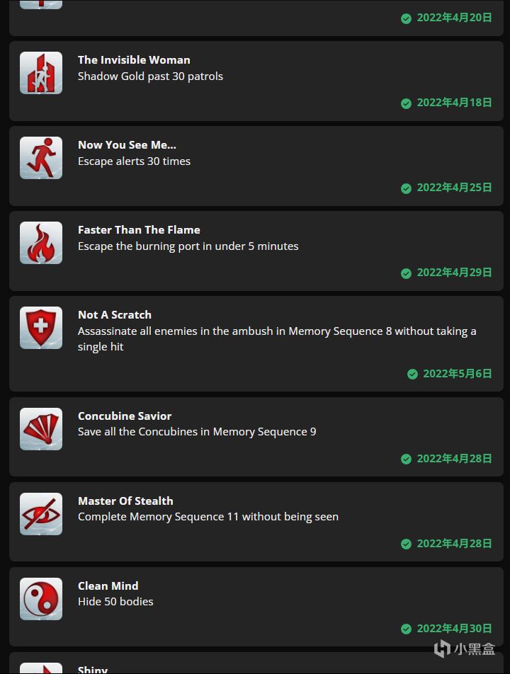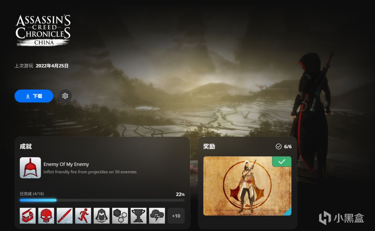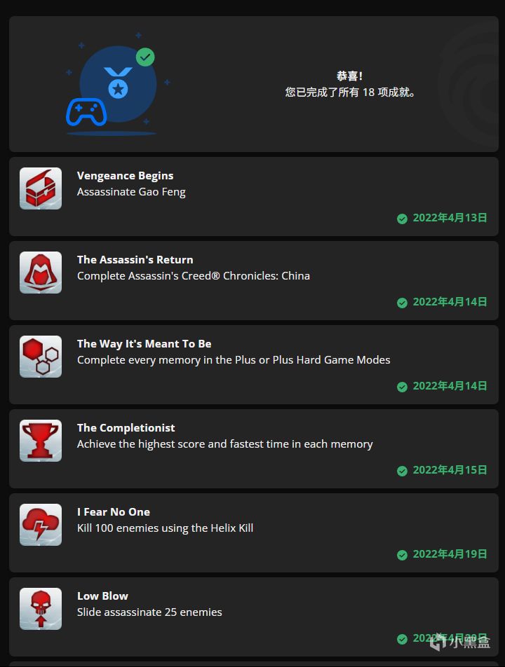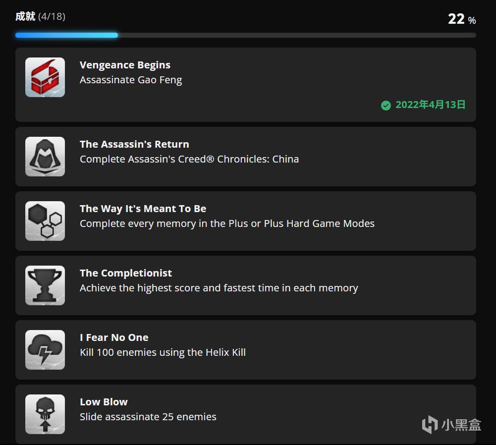 刺客信条编年史中国,我在2022年4月13日达成了首个成就,因为不习惯这种横版游戏,断断续续玩了几天就卸载了,现在把它下回来,用作演示,具体的18个成就信息如下: