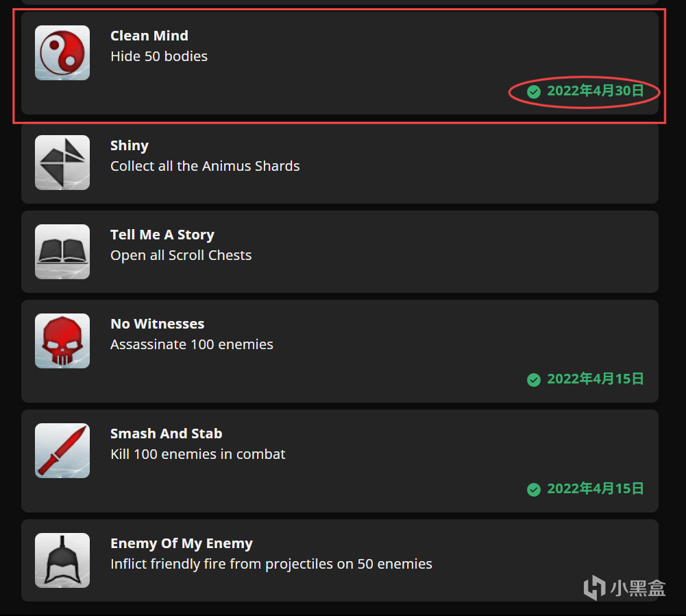 运行游戏,稍等一会从后台打开育碧客户端就可以看到,13号成就Clean Mind已经解锁了,日期正是2022年4月30日: