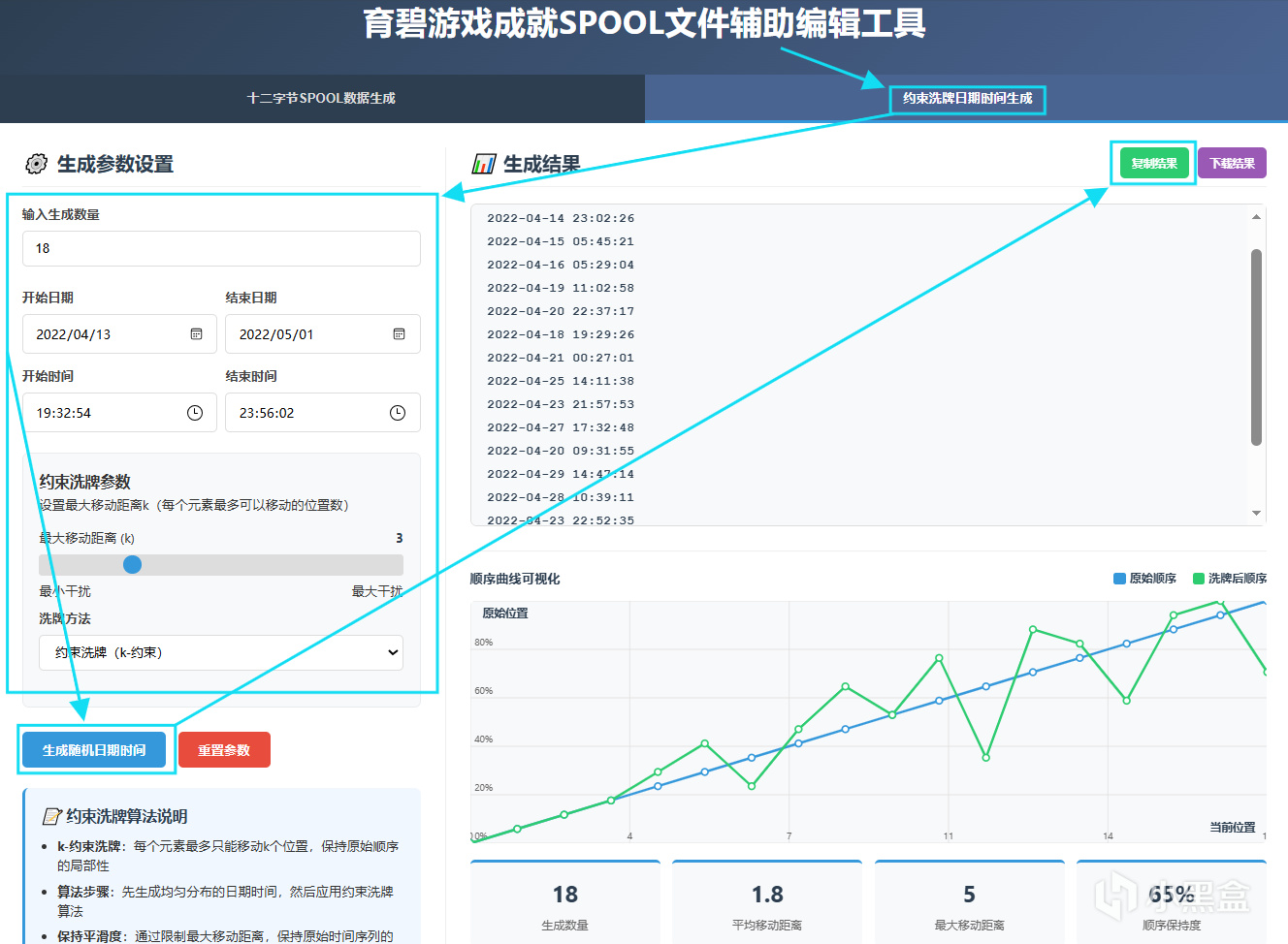 这里就要用到工具中的约束洗牌日期时间生成器了,输入生成数量为成就总数18,同时,我希望这18个成就的解锁日期范围在2022年4月13日至2022年5月6日之间,具体时间范围虽然无关紧要,因为成就解锁不会显示具体时间,但是我还是按照我的日常游戏时间把它设置在19:32:54至23:56:02之间,约束洗牌参数设置为3(这个算法实际上就是,先根据你设定的日期时间范围均匀生成预定数量的日期时间条目,然后依次对每个条目进行随机与其他条目替换位置的操作,同时约束每次替换时该条目可移动的最大位置距离,K值越小,越能保持整体日期时间序列趋势,反之则更随机化),然后点击生成随机日期时间(不喜欢可以一直点,直到看到顺眼的条目列表),最后点击右上角的复制结果: