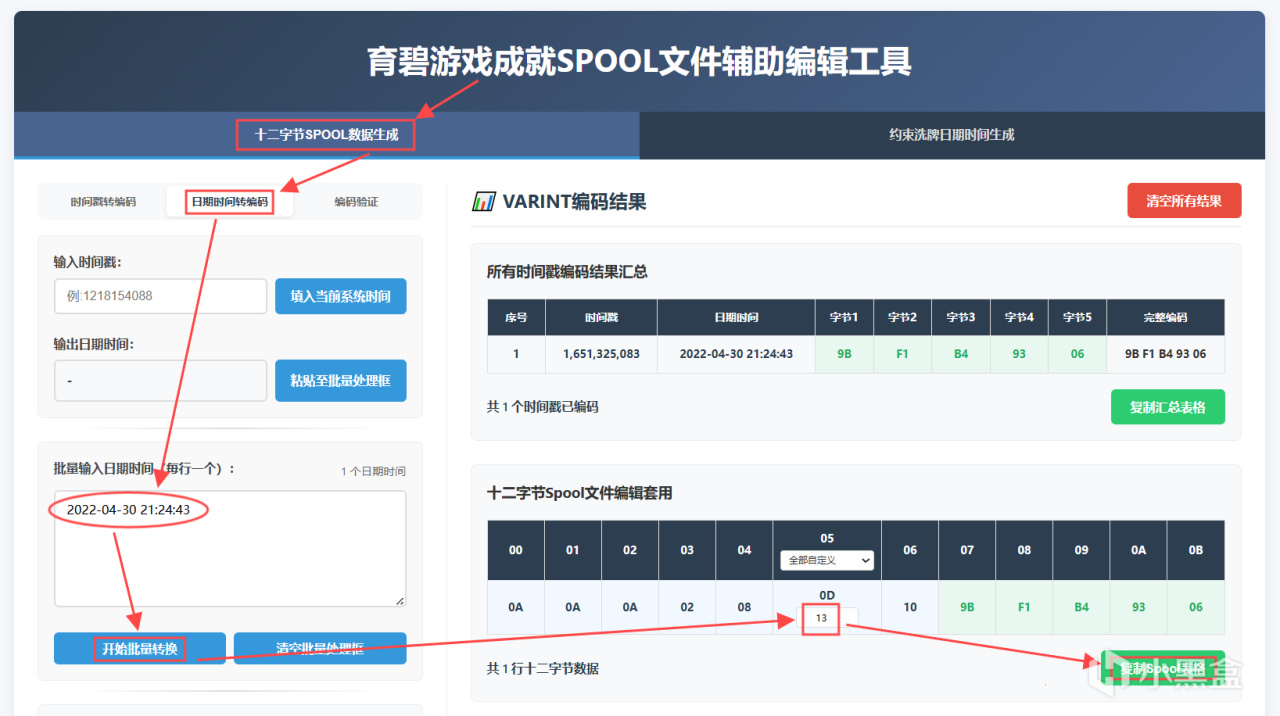 现在我要使用工具解锁第13个成就,就是第3张图的第1个太极图标那个成就:Clean Mind. 我希望这个成就的解锁日期时间是2022-04-30 21:24:43,把这个日期时间填入工具的日期时间转编码转换框中,点击开始转换:
