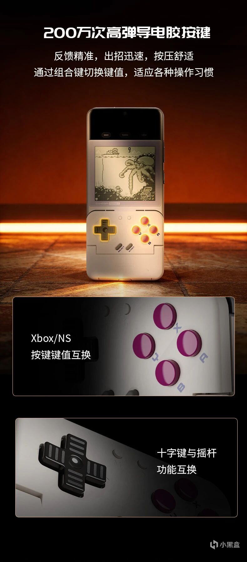 ABXY鍵與十字鍵均爲高彈導電硅膠按鍵,擁有200萬次壽命,反饋精準、按壓舒適,還可通過組合鍵,一鍵切換不同平臺的鍵位佈局。