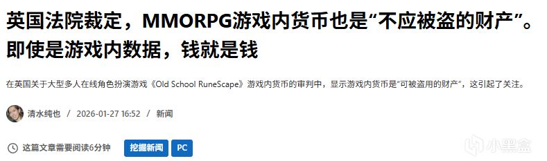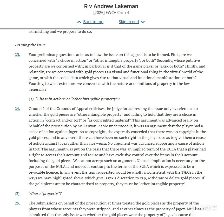 英國上訴法院近日在《老學校RuneScape》遊戲內貨幣糾紛案中裁定,遊戲內“金幣”屬於刑法上的“無形財產”,可成爲盜竊罪對象。這一判決推翻一審判決,被視爲虛擬資產法律地位的標誌性案例。