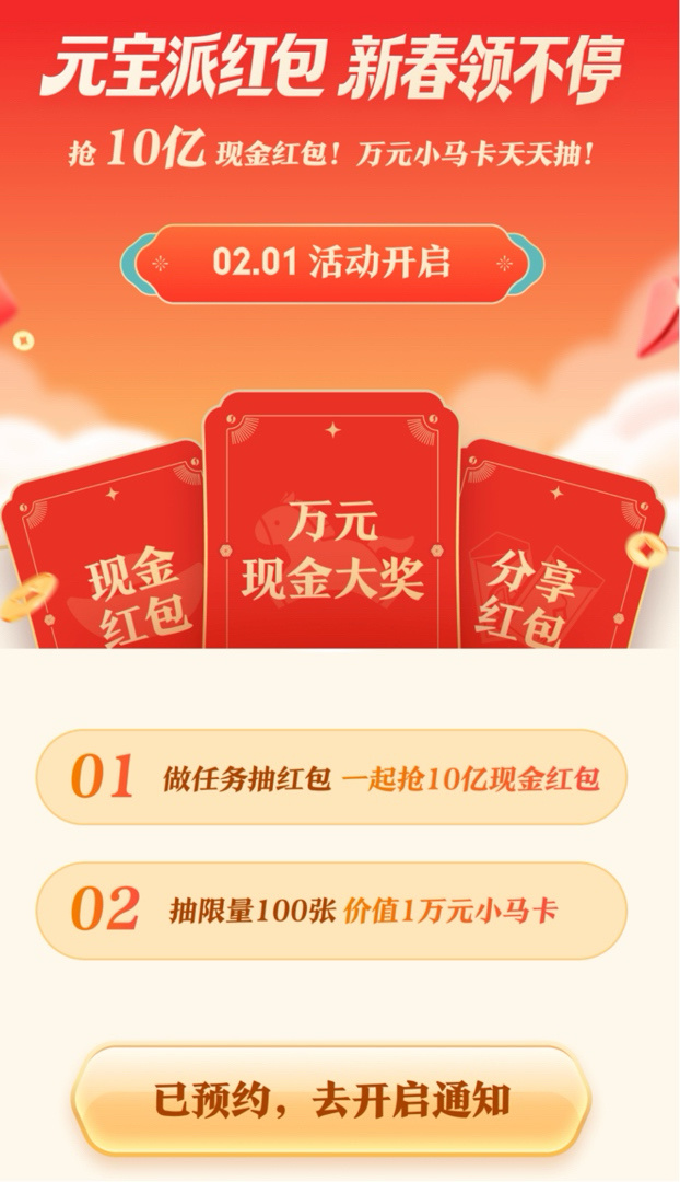 2月1日在元寶App上線春節紅包活動,用戶可參與分享10億元現金。