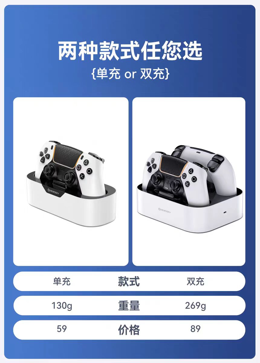 目前这款充电底座有单充和双充两个版本,这也给了玩家们更多选择空间,对于本身没有PS但是买PS5手柄的玩家,可以考虑入手单充版本;而对于双手柄PS5玩家,则是可以果断入手双充版本,并且两款充电底座价格都不算昂贵,分别售价59元和89元。