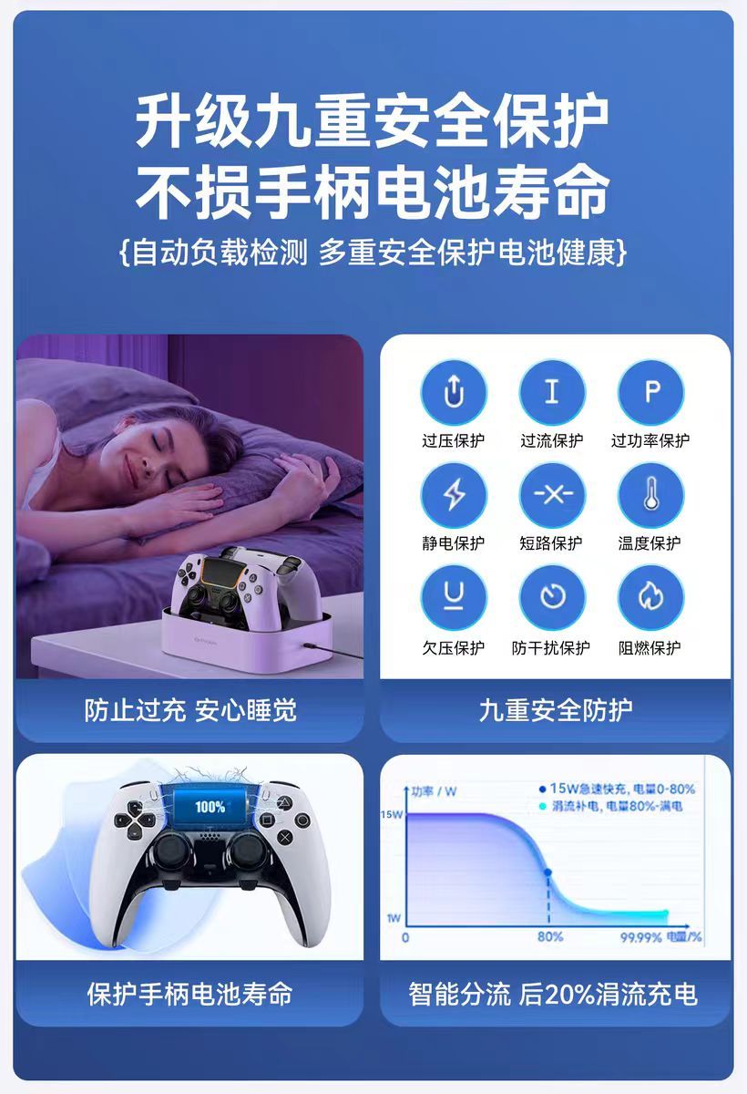 许多人不愿购买第三方座充,最大的原因还是安全性问题,这款座充为了解决这个问题,专门升级了九重安全保护,分别是过压保护、过流保护、过功率保护、静电保护、短路保护、温度保护、欠压保护、防干扰保护、阻燃保护。安全系数直接拉满,这也最大程度的保护了手柄电池寿命。