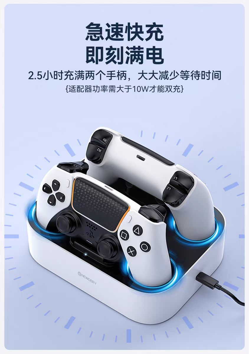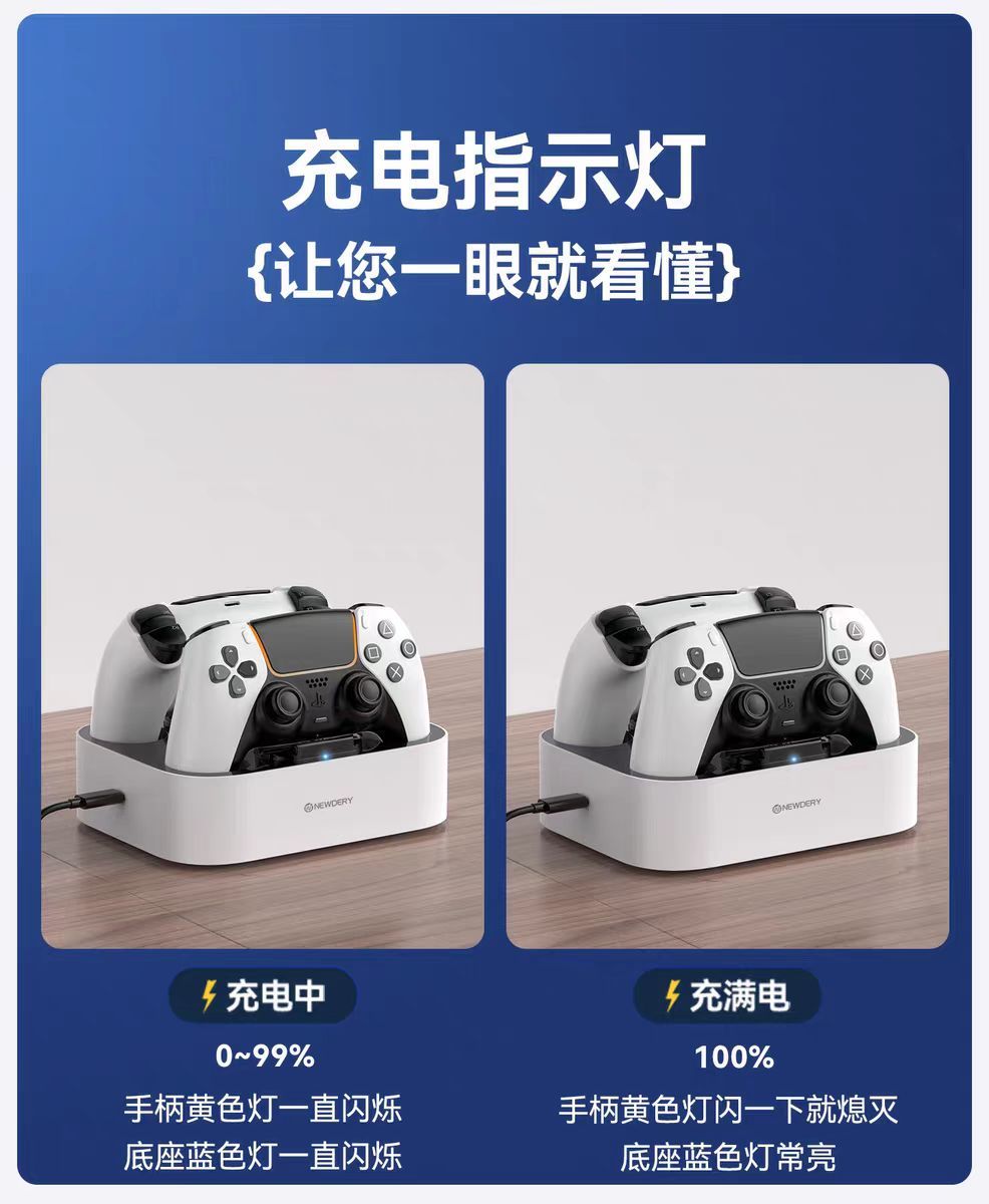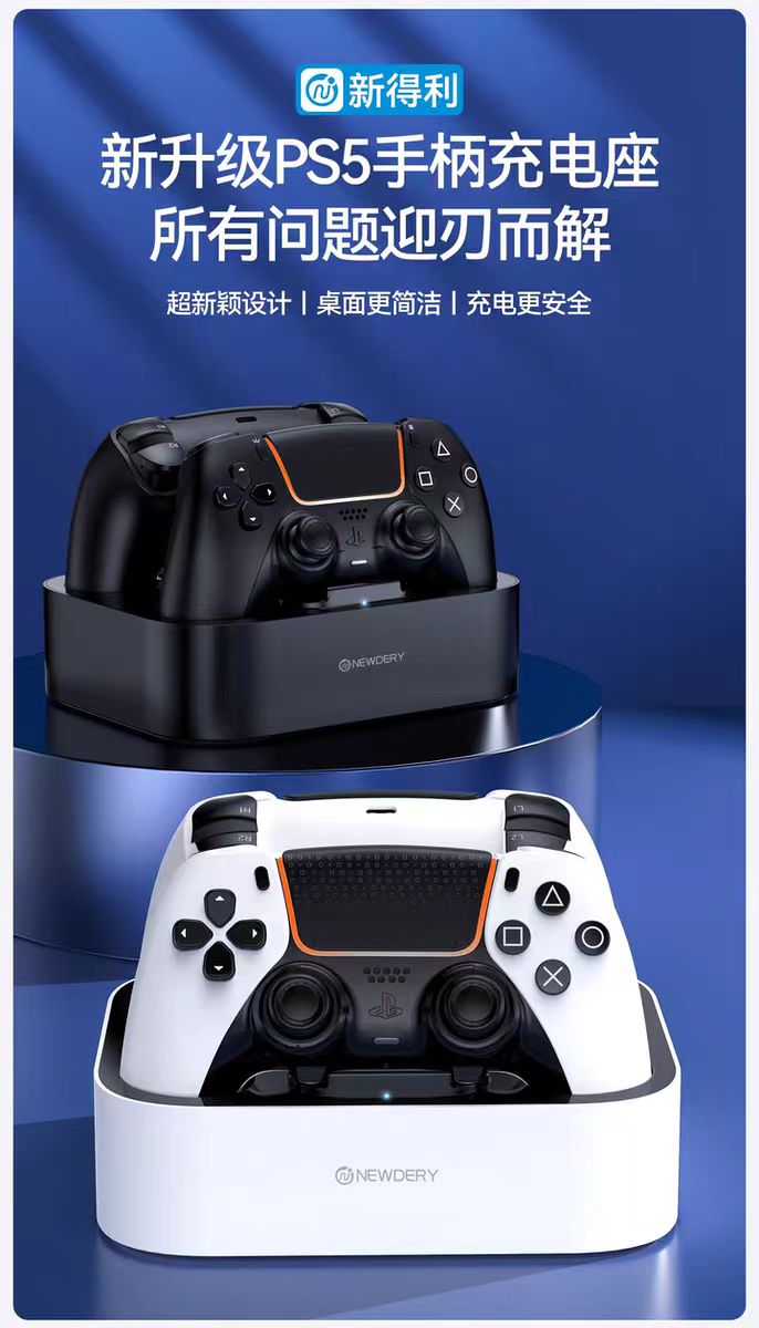 目前市面上的第三方PS5充电底座并不算少数,但大多数底座实际效果并不是特别优秀,其本质上共享是一款桌搭好物,这对于追求实用性的玩家来说显然不合胃口,而新得利家的这款索尼PS5手柄座充则是主打一个好用实用。