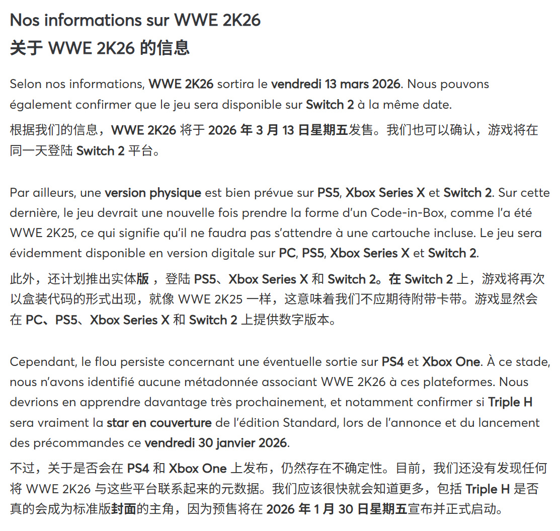 更多明确信息预计很快将会揭晓,因为《WWE 2K26》计划于2026年1月30日正式公布并开启预售。Billbil-kun还提到,此次公告可能会确认Triple H是否确实是标准版的封面人物。