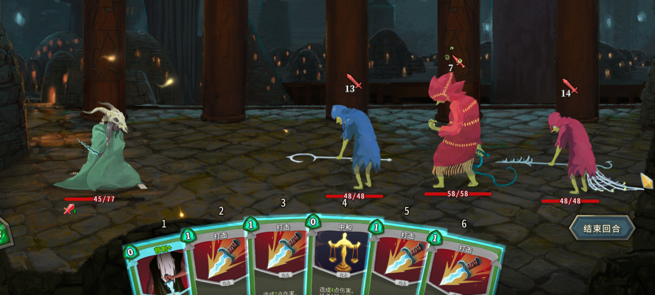 盾的循环是三个一组,前两回合痛击(造成12点左右的伤害,并且减少玩家1力量/充能)和加固(群体加30点格挡)顺序随机,第三回合固定使用粉碎,造成34点伤害,并且获得造成伤害数值的格挡,高进阶直接99点格挡,其他伤害数值也会提升。所以我们一般都是先面向高伤害的矛,优先击杀他之后回过头来打盾。