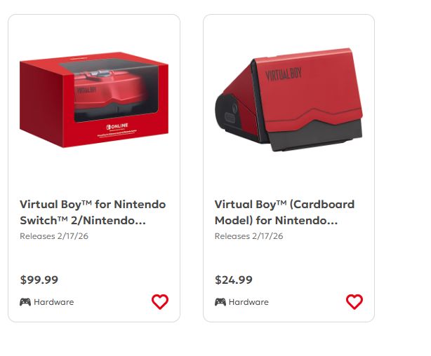 Virtual Boy外設計劃推出兩種版本:定價99.99美元的塑料復刻版,以及定價24.99美元的紙板"Labo風格"版本。兩種外設均允許玩家將Switch或Switch 2主機插入頭戴式框架,以還原原版的立體3D觀看形式。