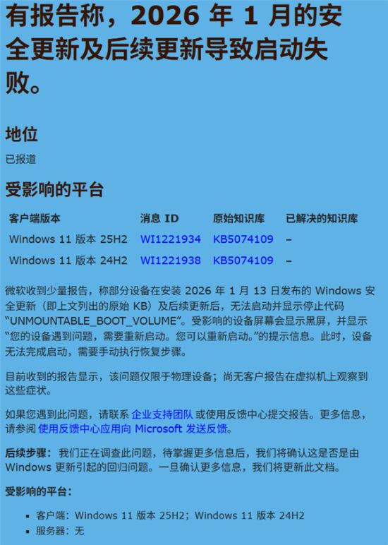 近日,微软Windows 11的安全更新再次引发严重问题,部分用户在安装2026年1月的安全更新后,电脑直接无法启动,屏幕显示黑屏并提示“UNMOUNTABLE_BOOT_VOLUME”错误。