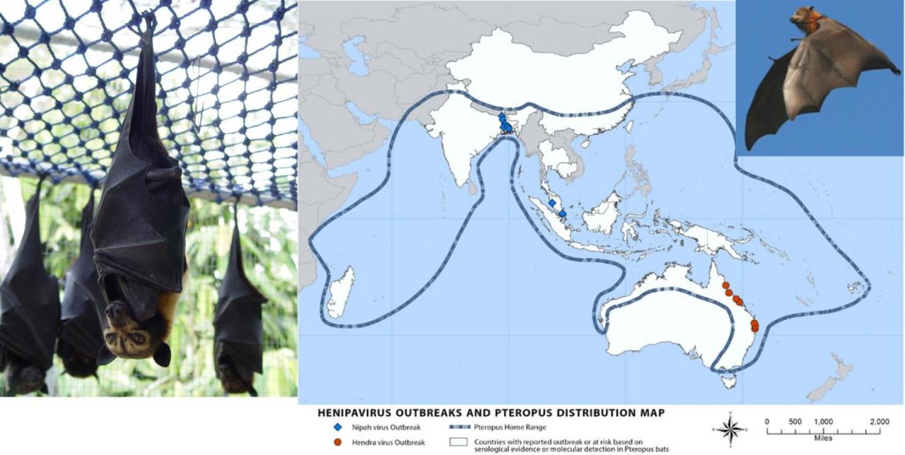 1998年首次在马来西亚被发现,最初因误诊为其他疾病导致防控受阻,后从患者体内分离出该新型病原体才明确病因。其天然宿主为狐蝠科的果蝠,这类蝙蝠可长期携带病毒并通过排泄物排毒,却自身不发病,堪称“病毒储存库”。