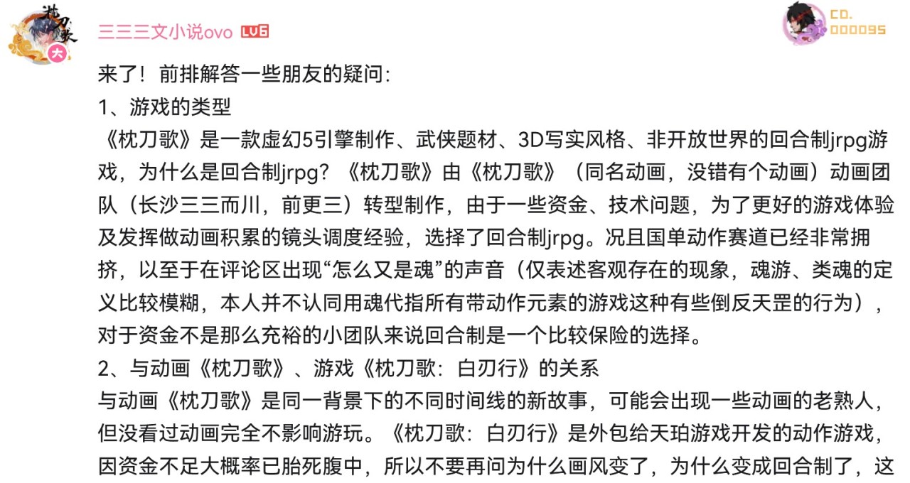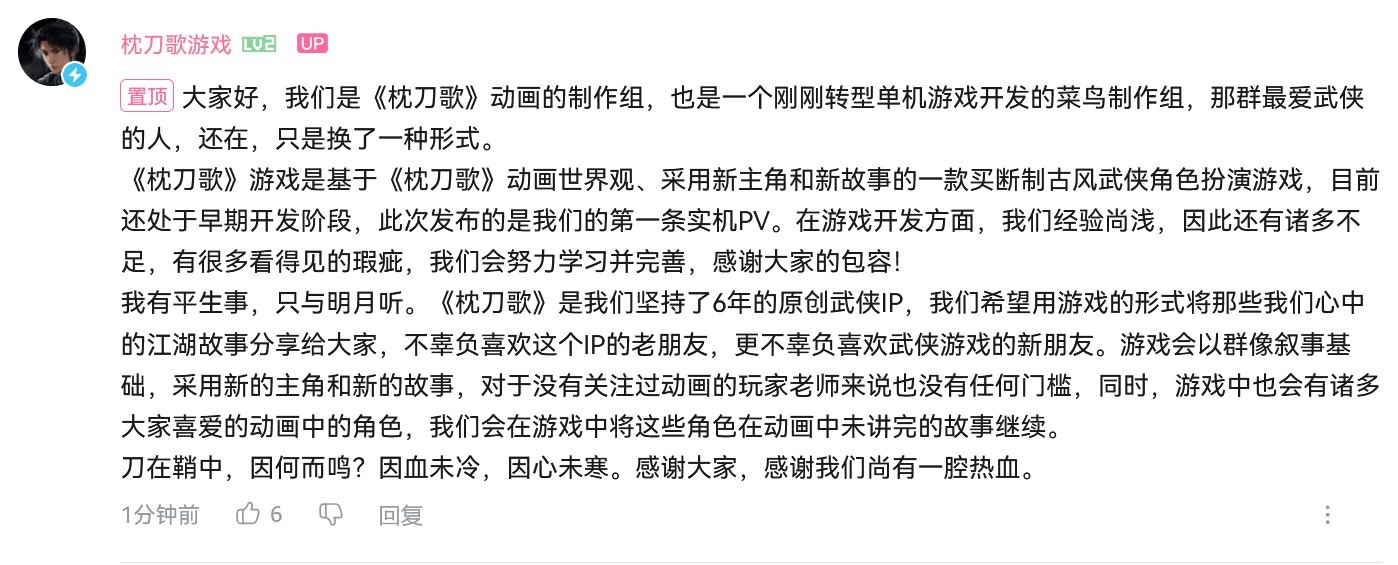 今日,枕刀歌遊戲、枕刀歌動畫、嗶哩嗶哩遊先看聯合發佈國產武俠單機《枕刀歌》首支預告片。