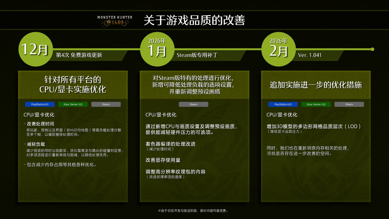 《怪物獵人:荒野》Steam版1.040.03.01版本更新推出了針對性性能優化,旨在降低CPU負載、減少顯存佔用並提升整體視覺穩定性。本次更新還新增了CPU相關配置選項,並擴展了多項畫面控制功能。