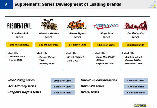 其他系列表现同样亮眼:《洛克人》系列累计销量4400万份,《鬼泣》系列3800万份,《丧尸围城》系列1900万份,《漫画英雄VS卡普空》系列1300万份,《大神》系列480万份。