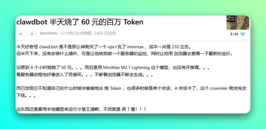 使用「Moltbot」的核心依赖 API 运行,而使用 API 就会消耗 Token,这一点一定要注意,有网友调侃一夜起来消耗了一套房。