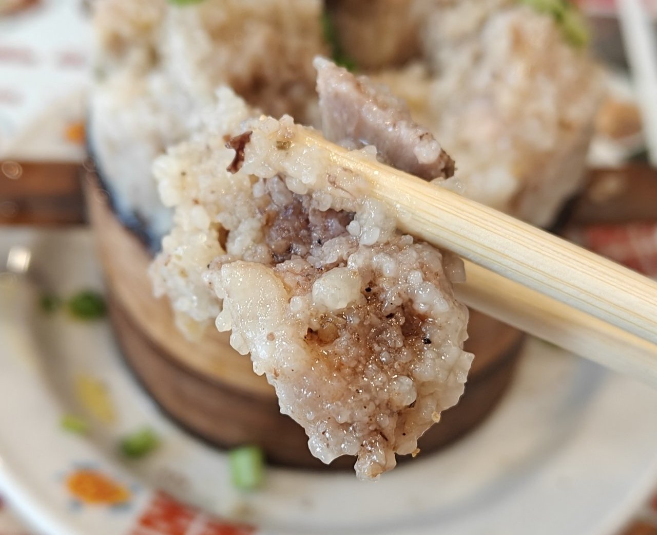 這次我只嚐了排骨格格,原因無他,團購便宜只要12.9。味道確實相當正,醃製時沒放辣椒,上桌前撒上一點花椒粉和蔥花,是鹹鮮微麻的味型,蒸得非常透,排骨軟嫩不柴,米粉溼潤入味,墊底的紅薯也十分軟糯了,是好喫的