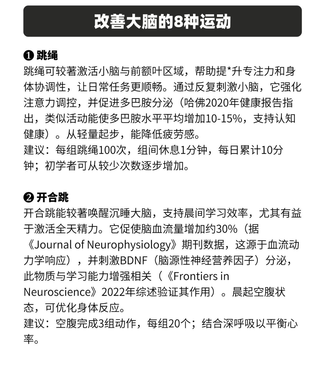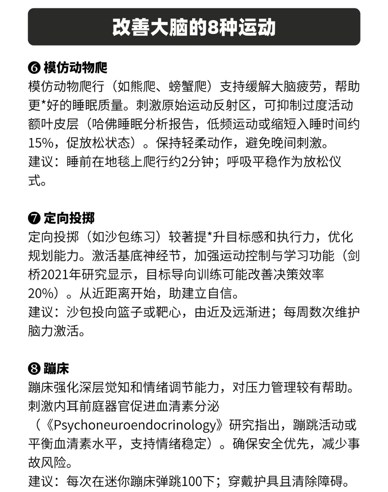 < Neuroscience>>2022年綜述驗證其作用)。晨起空腹狀態,可優化身體反應。 建議:空腹完成3組動作,每組20個;結合深呼吸以平衡心率。 3折返跑 折返跑有效增強工作記憶和反應速度,幫助更敏捷應對生活挑戰。快速變向動作刺激海馬體(關鍵記憶區域),促進神經元新生(2019年《Nature》研究顯示,相關活動或提高海馬體活躍度10%,支持思維靈活性)。在安全環境下練習,能積累信心。 建議:設定5米標誌物距離,往返10次爲1組,每日2組;避免過快防止拉傷。 4單腳站立 單腳站立較著激活前庭系統,減少日常分心頻率,培養專注習慣。平衡改變迫使大腦協調整合視覺,觸覺信號(哈佛追蹤調查表明,日常練習可能降低干擾發生率20%),逐步挑戰可提*升穩定性。新手從簡單方式起步較合適。 建議:左右腳各站立1分鐘,後續嘗試閉眼;每日堅持維護注意力改善。 5拍球運動 雙手交替拍球較好鍛鍊手眼協調和抗干擾能力,適用於多元環境任務。它激活胼胝體(腦部信息橋樑),促進左右腦交換效率(< 建議:單手拍球50次後換手;室內靜音區練習助入門。 6模仿動物爬 模仿動物爬行(如熊爬,螃蟹爬)支持緩解大腦疲勞,幫助更*好的睡眠質量。刺激原始運動反射區,可抑制過度活動額葉皮層(哈佛睡眠分析報告,低頻運動或縮短入睡時間約15%,促放鬆狀態)。保持輕柔動作,避免晚間刺激。建議:睡前在地毯上爬行約2分鐘;呼吸平穩作爲放鬆儀式。 7定向投擲 定向投擲(如沙包練習)較著提*升目標感和執行力,優化規劃能力。激活基底神經節,加強運動控制與學習功能(劍橋2021年研究顯示,目標導向訓練可能改善決策效率20%)。從近距離開始,助建立自信。 建議:沙包投向籃子或靶心,由近及遠漸進;每週數次維護腦力激活。 8蹦牀 蹦牀強化深層覺知和情緒調節能力,對壓力管理較有幫助。刺激內耳前庭器官促進血清素分泌 (< 建議:每次在迷你蹦牀彈跳100下;穿戴護具且清除障礙。 內容僅供參考,如有不適請及時就醫 更多遊戲資訊請關註:電玩幫遊戲資訊專區 電玩幫圖文攻略 www.vgover.com![]()