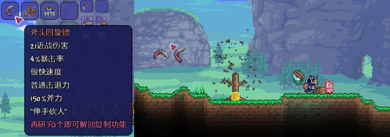 斧头回旋镖,近战武器,与之前宣传效果一样,可以砍树。