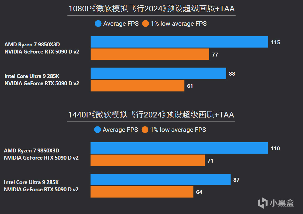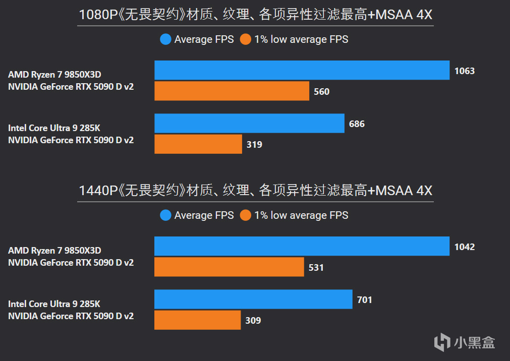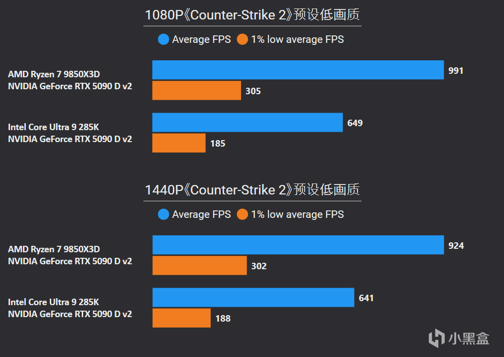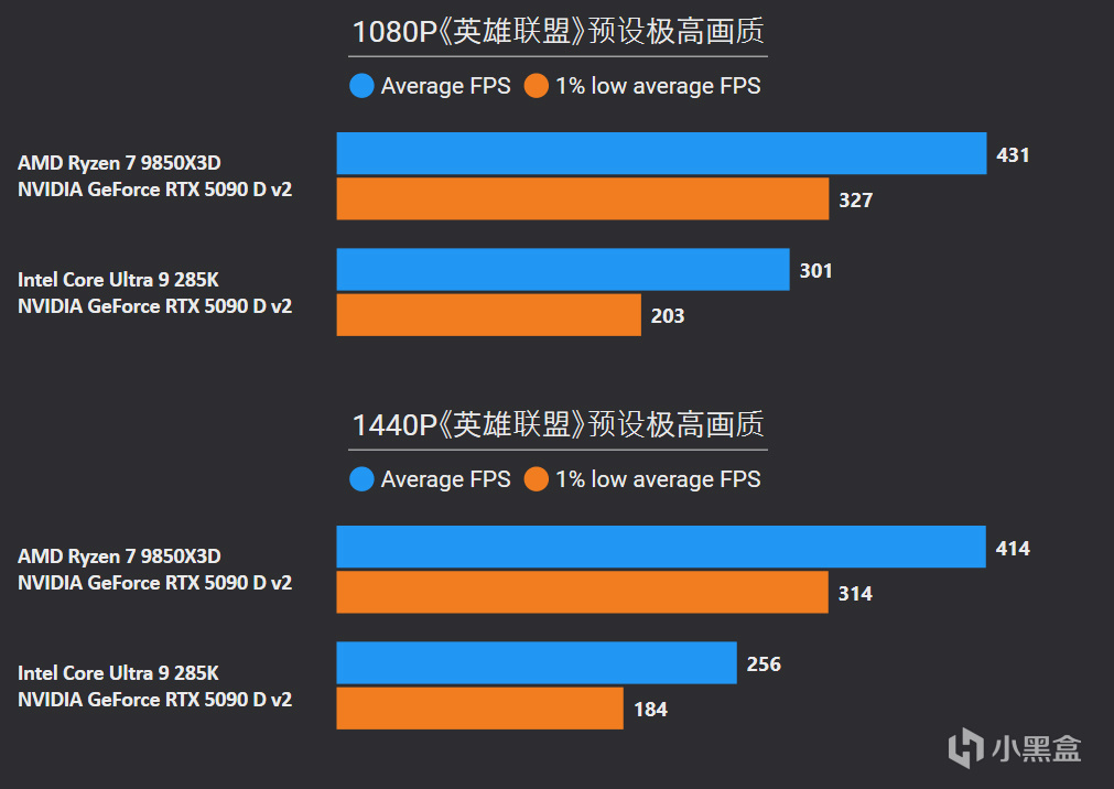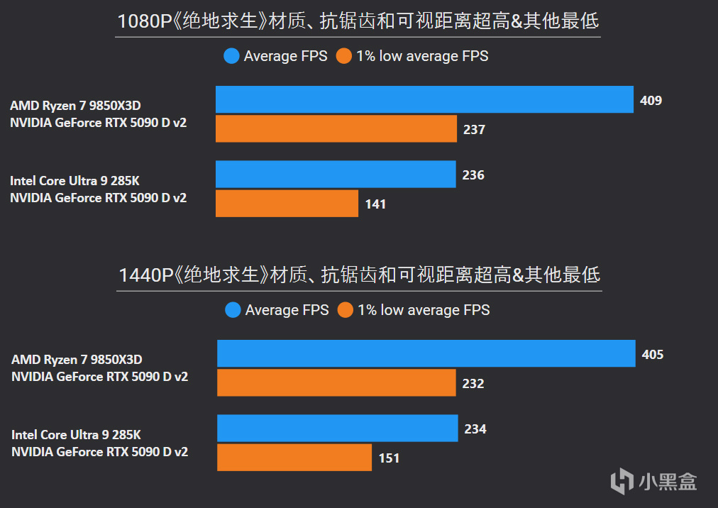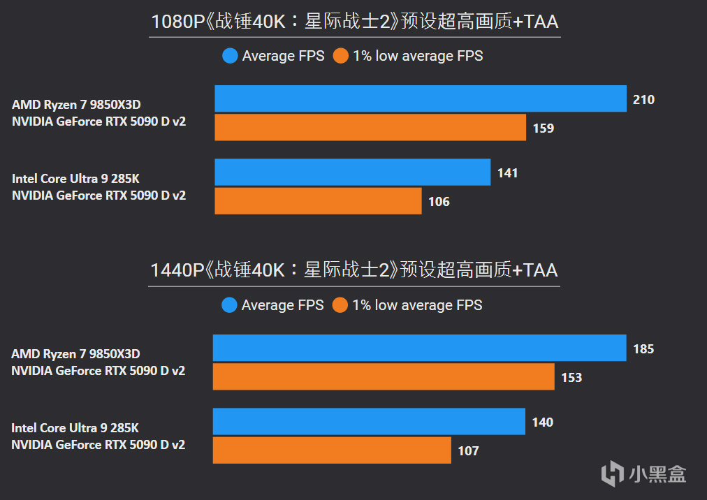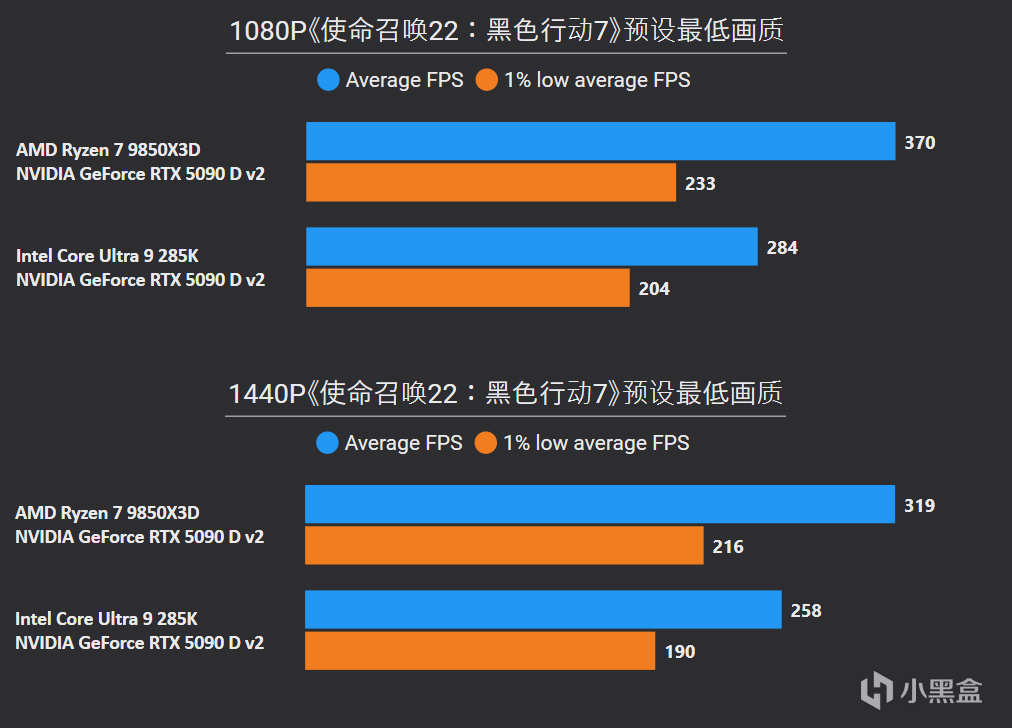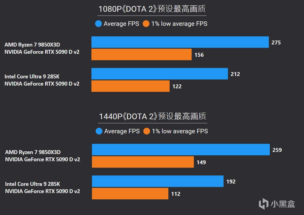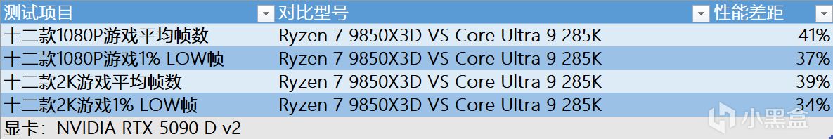 对比更高价位的Core Ultra 9 285K,1080P游戏平均帧率直接无情屠戮41%,1% LOW帧也有37%提升幅度,并且在2K分辨率中同样优势巨大。