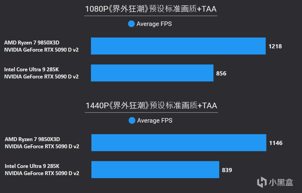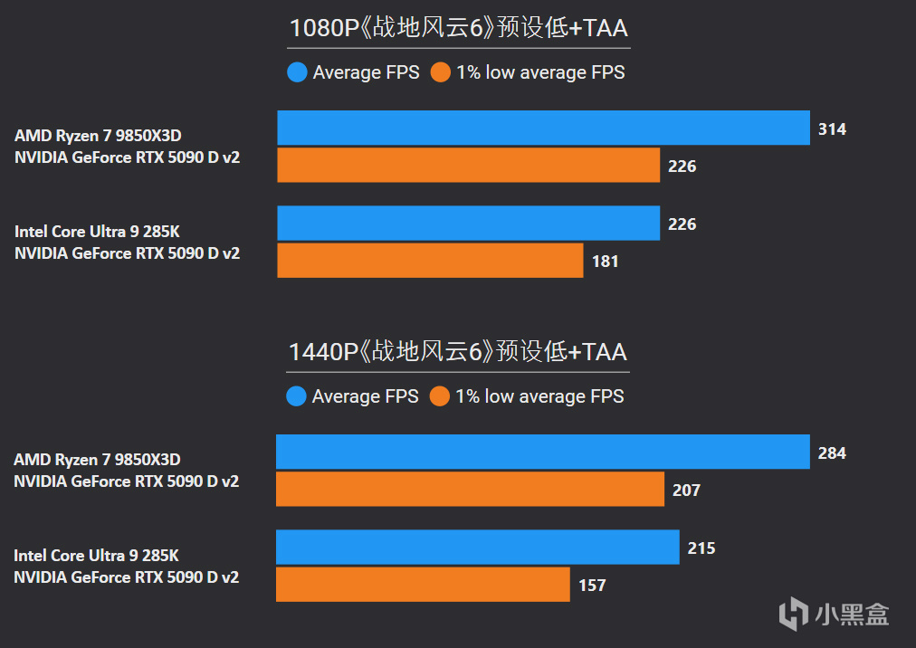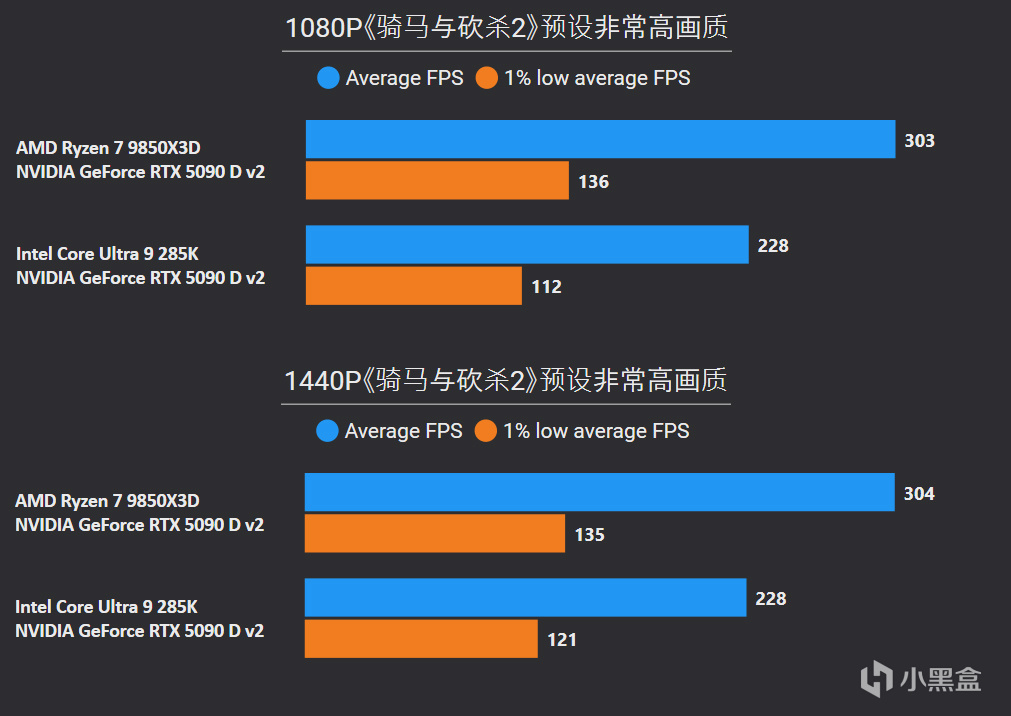 如今2K电竞显示器顶尖产品已经来到500HZ刷新率,主流产品覆盖200~300HZ刷新率,所以2K项目测试也更具实际意义。整体而言,锐龙7 9850X3D还是碾压般的存在,平均帧数依然领先39%幅度,1% LOW帧则有34%优势,像《使命召唤22》、《绝地求生》、《骑马与砍杀2》等项目,锐龙7 9850X3D都能完美匹配300HZ显示器,对手Core Ultra 9 285K表现则是远低于300fps。