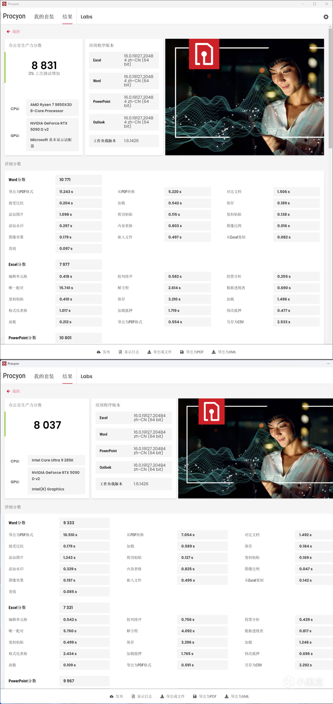 Procyon办公室生产力分数,涉及Word、Excel、PowerPoint和Outlook经典Office四大套件,整体分数来说,在这种极具日常代表性的单核项目中,锐龙7 9850X3D可领先Core Ultra 9 285K达到10%幅度,尤其是Word项目,锐龙7 9850X3D甚至达到了15%明显领先幅度。