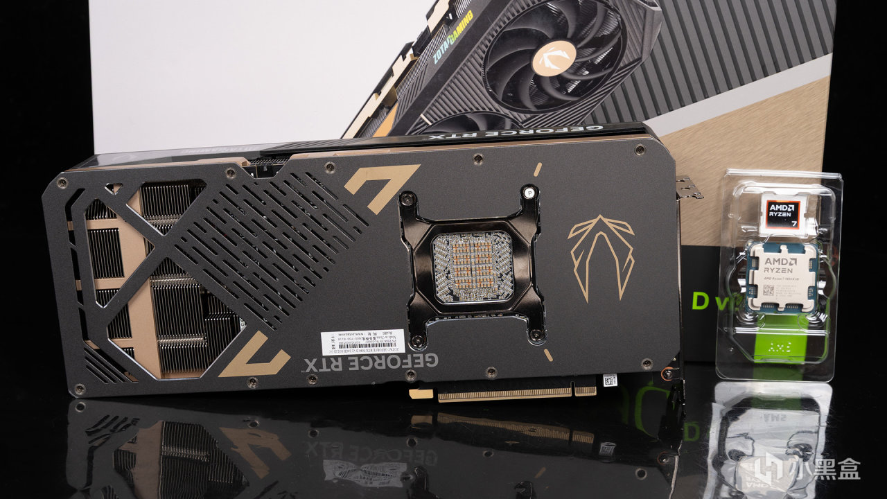 显卡配备全覆盖金属背板,能起到结构增强和辅助元件散热的作用。索泰还针对这颗旗舰GPU核显,还加入了GPU固定支架,能优化压力分布和紧密度,提升VC均热板效率。