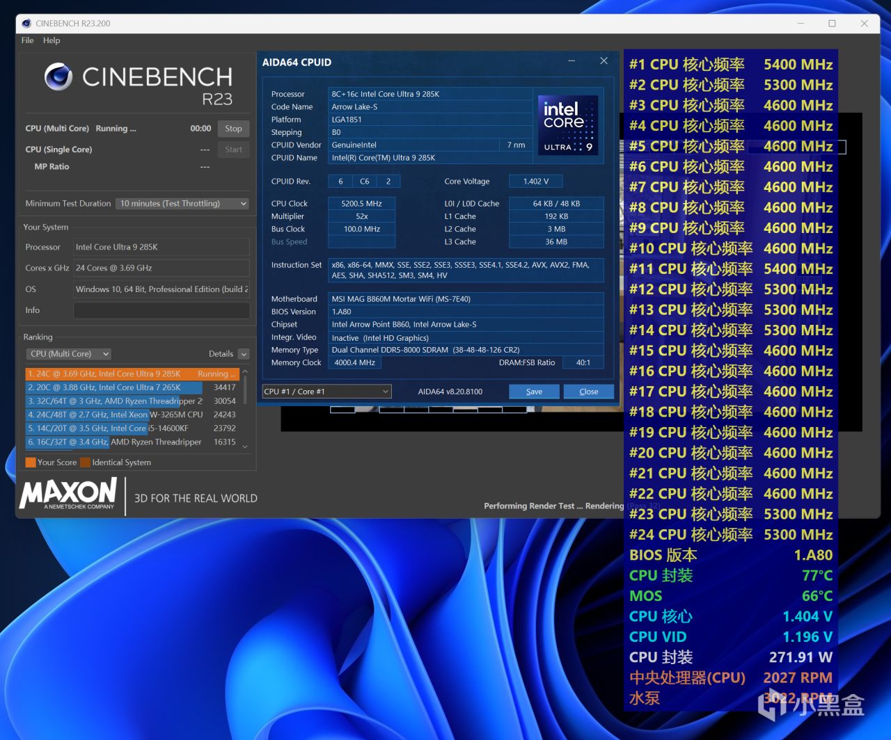 Core Ultra 9 285K运行CINBENCH R23多核项目十分钟,CPU二极管温度为77℃,软显功耗为271W。
